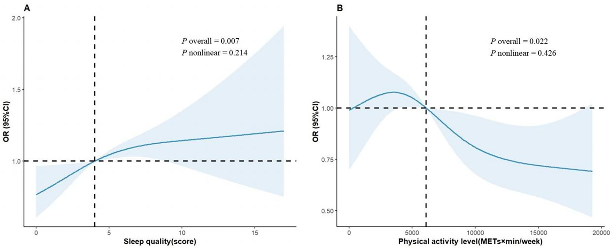 The software Stata 17.0, R 4.4.0, and GraphPad Prism 9.5 were used for data processing and analysis. Continuous variables at baseline data are reported as mean ± standard deviation or median (interquartile range, IQR), while categorical variables are presented as percentages. Continuous variables with normal distributions were assessed using t-tests or Analysis of Variance (ANOVA), whereas those not normally distributed were examined through rank-sum tests. Categorical data assessment was conducted with chi-square tests. Missing data were imputed using multiple imputation. To assess the potential relationship between sleep quality, PA levels, and hypertension prevalence. A restrictive cubic spline (RCS) model was used to evaluate the dose-response relationship, with adjustments for potential confounding factors such as sex, age, educational attainment, marital status, smoking, alcohol ingestion, DDS, BMI, and total PA or PSQI score. Binary logistic regression analysis was used to explore the associations between various levels of PA, or sleep quality and the prevalence of hypertension. This study further conducted sensitivity analyses to verify the robustness of the results. Model 1 was adjusted for age and sex. Model 2 further adjusted for educational attainment, marital status, smoking, alcohol consumption, DDS, and BMI. The results are presented as odds ratios (OR) with 95% confidence intervals (95% CI), with a two-sided P values <0.05 were considered statistically significant.