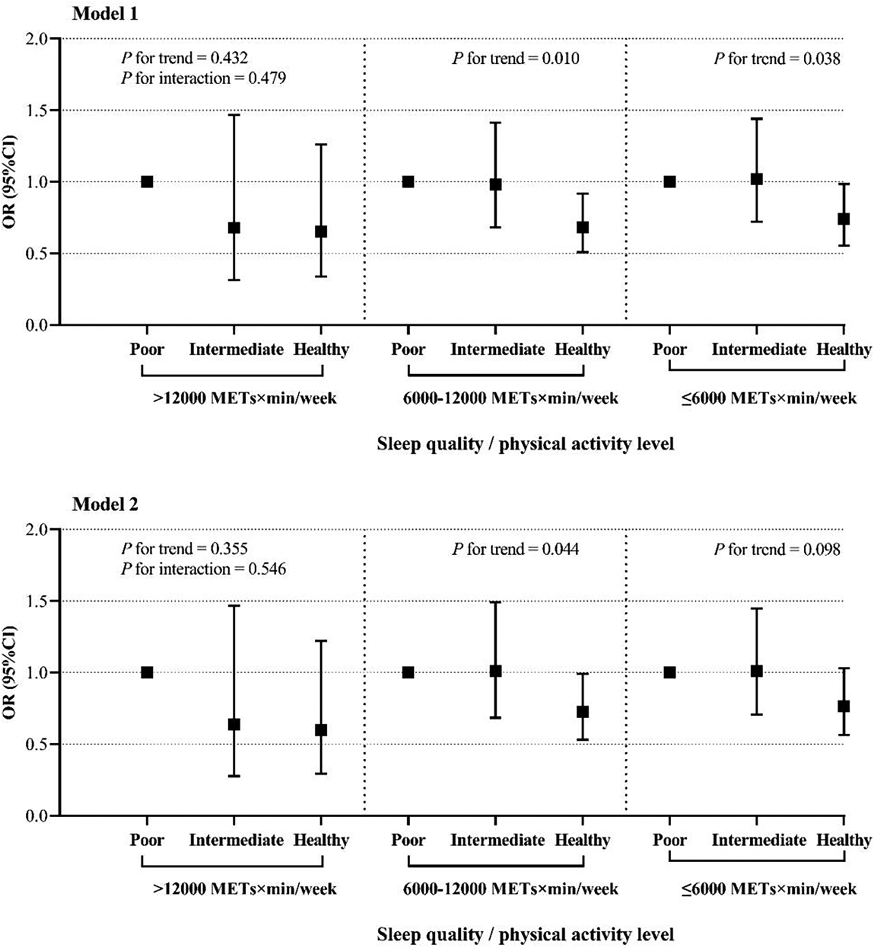 The relationship between sleep quality and the prevalence of hypertension at different PA levels. The figure presents odds ratios (ORs) and 95% confidence intervals (CIs) for hypertension prevalence across different sleep quality categories (poor, intermediate, and healthy) stratified by PA levels (>12,000 METs × min/week, 6,000–12,000 METs × min/week, and 56,000 METs × min/week). Model 1 was adjusted for age and sex. Model 2 was adjusted for age, sex, educational attainment, marital status, smoking status, household annual total income, alcohol ingestion, DDS, BMI. P for trend indicates the trend across sleep quality categories within each PA level group, and P for interaction assesses the interaction between sleep quality and PA level on hypertension prevalence.