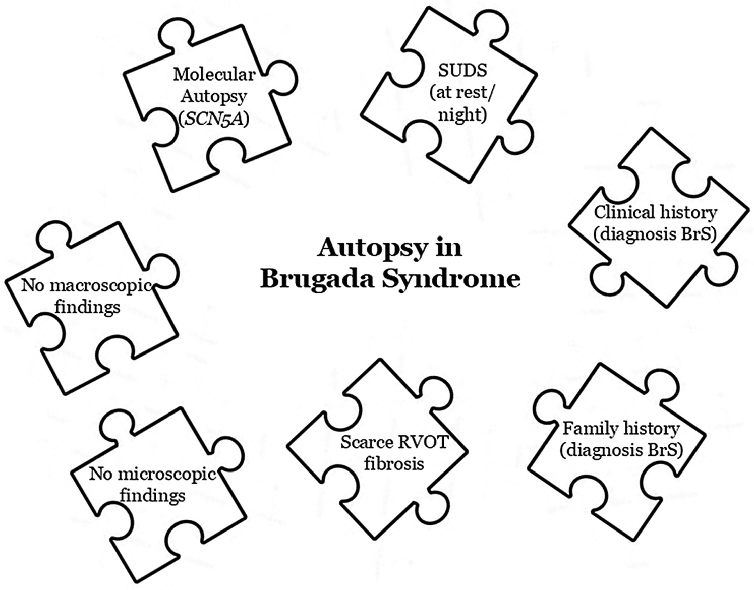 BrS cases are often considered completely “silent” at the autopsy. Today, several elements (including situation of death, clinical family history, macroscopic/microscopic findings, molecular autopsy) should be taken into account to support a conclusion of BrS as the cause of an unexpected and unexplained death. To date no case with a definitive diagnosis of BrS has progressed to the definitive diagnosis of any cardiomyopathy, reinforcing BrS as a pure ion channel disease without structural heart alterations. However, this does not mean that the presence of microscopic cardiac anomalies should exclude BrS as a potential diagnosis despite the need to clarify if these scattered tissular alterations are the cause or may be a consequence of the malignant arrhythmia.