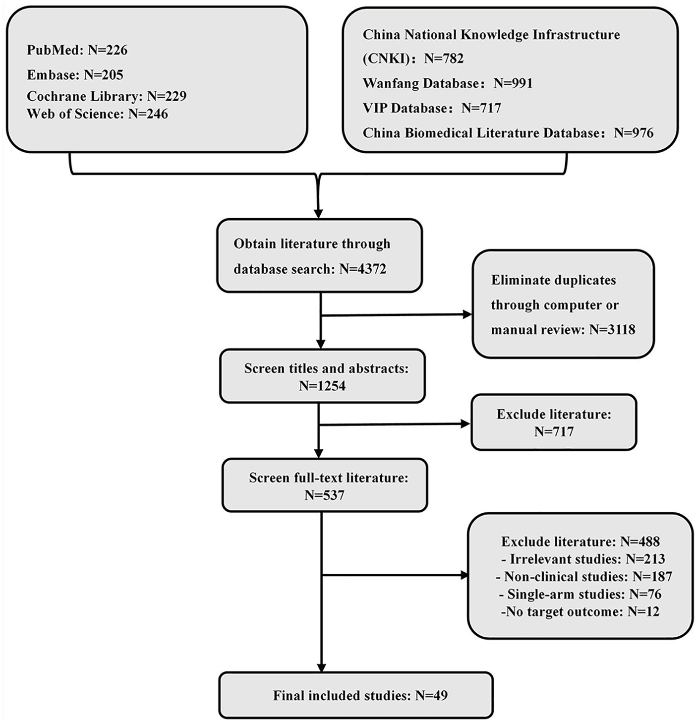 A preliminary search identified 4,372 publications. After removing duplicates, 1,254 articles were screened. Following a review of titles and abstracts, 717 articles were excluded, leaving 537 for full-text review, ultimately resulting in the inclusion of 49 RCTs (14–62). The analysis included 5,535 patients and evaluated 14 different interventions: Shenfu injection, Shenmai injection, Shengmai injection, Danshenketo II A sulfonate injection, Danhong injection, Danshen injection, Shuxuetong injection, Danshenketo injection, Danshen polyphenol salt injection, Xuesaitong injection, Danshen Chuanxiong injection, Kudiezi injection, Ginkgo biloba injection, and standard treatment. The literature screening process is illustrated in Figure 1, and the basic characteristics of the included studies are detailed in Table 2.