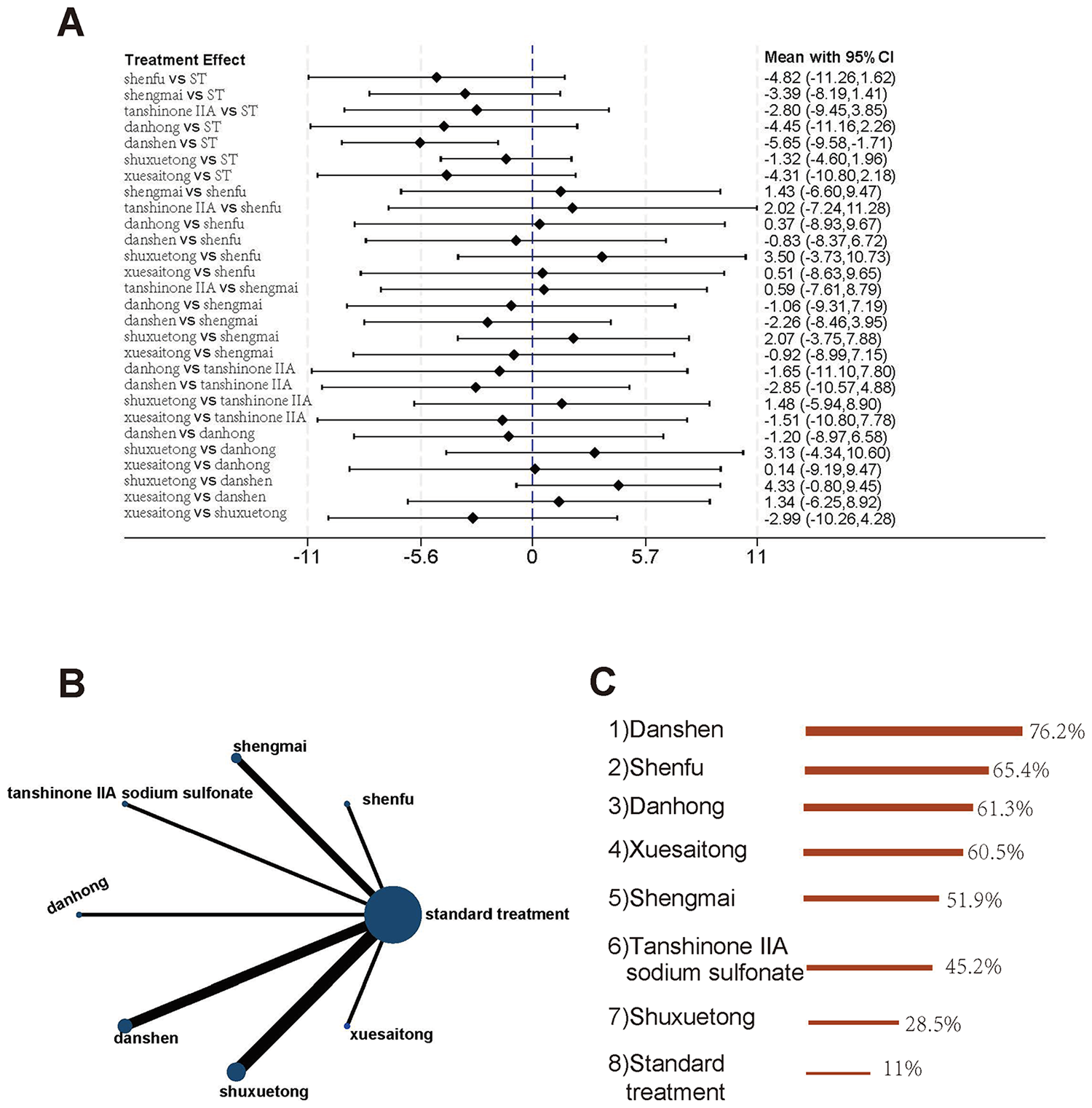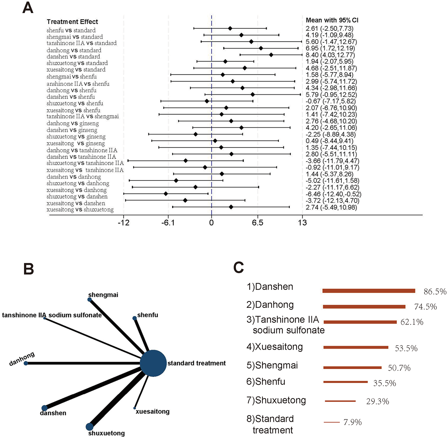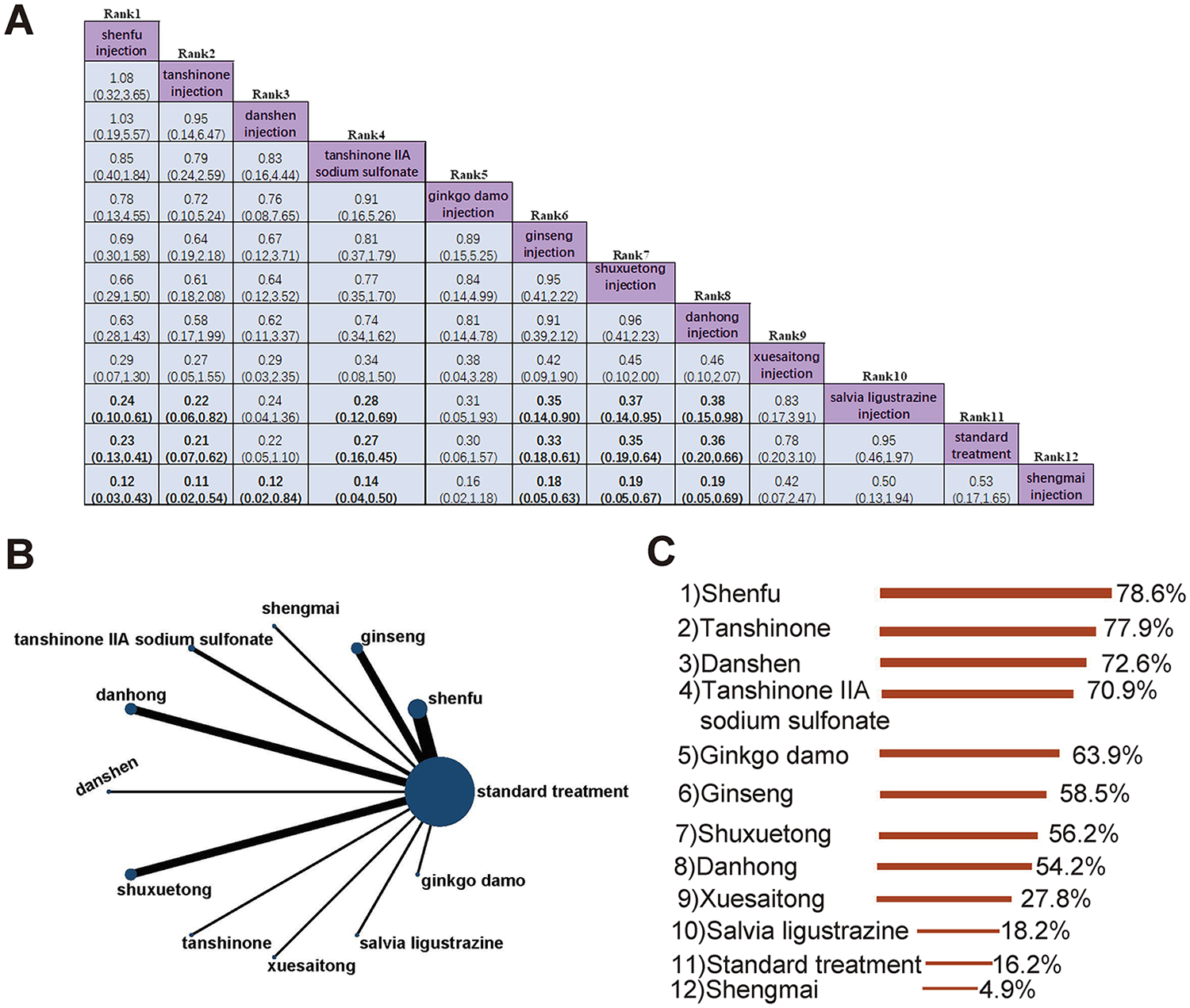 Percutaneous coronary intervention (PCI) is a crucial therapeutic approach for ACS that significantly improves myocardial blood flow and reduces mortality. However, complications such as the no-reflow phenomenon (NRP) and coronary slow-flow phenomenon (CSFP) can occur post-PCI, potentially enlarging the myocardial infarction area and worsening prognosis, thus increasing mortality and the risk of recurrent myocardial infarction (3). The incidence of NRP in selective PCI for Acute Myocardial Infarction (AMI) ranges from 0.6% to 6.0%, while it is higher (10.0% to 50.0%) in emergency settings (4). This underscores the substantial risk of NRP in this population and highlights the critical need for timely intervention to improve clinical outcomes. From the perspective of Traditional Chinese Medicine (TCM), no-reflow or slow flow after PCI in ACS patients falls under the categories of “chest bi” (chest obstruction) and “true heart pain”. The condition is primarily attributed to Qi Deficiency and Blood Stasis, often accompanied by Yang Collapse. The therapeutic principles are therefore to Supplement Qi, Warm Yang, Activate Blood Circulation, and Resolve Stasis. Modern pharmacological research has demonstrated that TCM injections developed under these principles exhibit multi-target effects, including anti-inflammatory, antiplatelet, antithrombotic, and vascular endothelial protective properties (5). These mechanisms align with the pathological processes of no-reflow, such as microvascular obstruction and ischemia-reperfusion injury, thereby providing a solid theoretical and mechanistic basis for the application of TCM injections in this context and for the subsequent network meta-analysis evaluating their comparative efficacy.