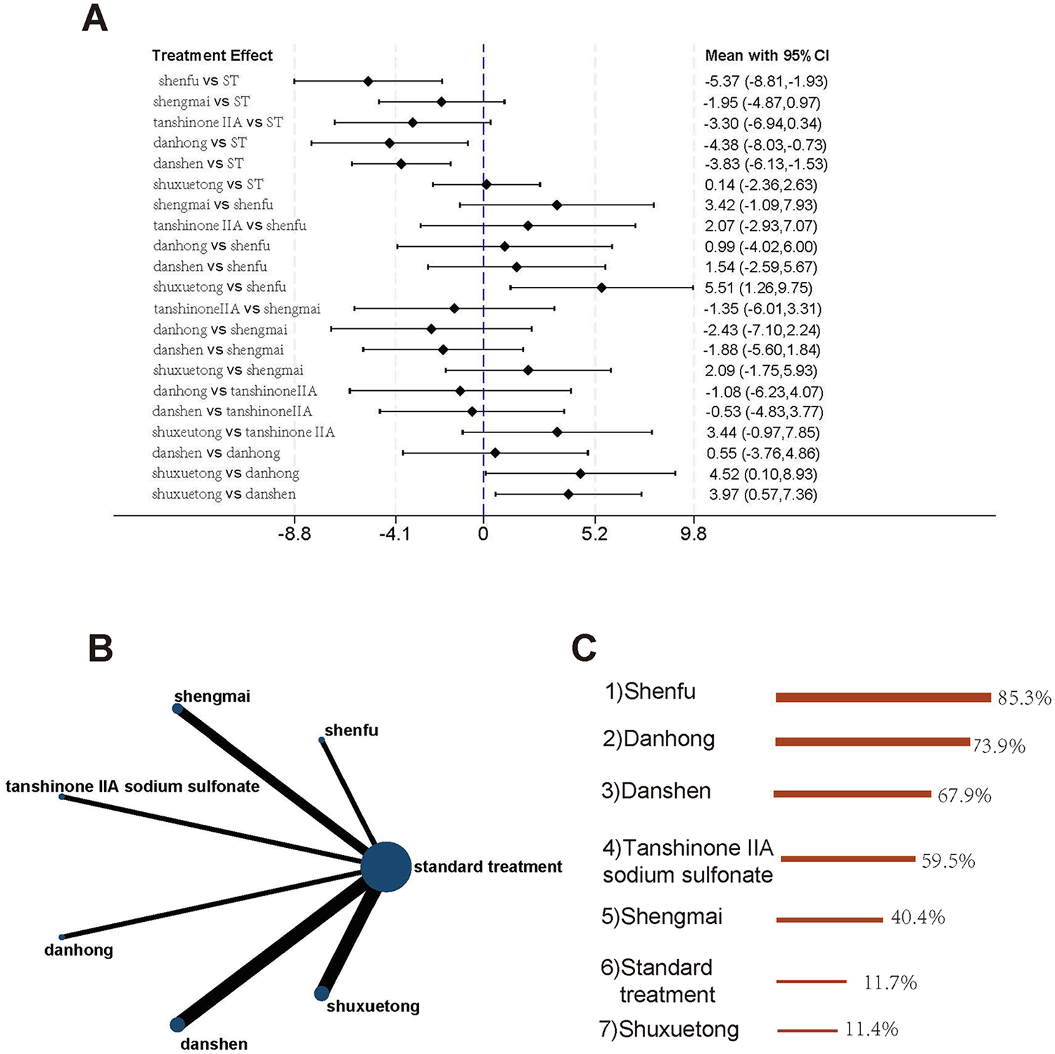 A total of 14 interventions were evaluated, involving 5,535 patients. The interventions encompassed 14 types, including Shenfu Injection, Ginseng Injection, Shengmai Injection, Tanshinone IIA Sodium Sulfonate Injection, Danhong Injection, Danshen Injection, Shuxuetong Injection, Tanshinone Injection, Salvianolate Lyophilized Injection, Xuesaitong Injection, Salvia Ligustrazine Injection, Ixeris Sonchifolia Injection, Ginkgo Damo Injection, and standard treatment. The results indicated that the combination of salvianolate lyophilized injection with standard treatment might provide the best efficacy in improving no-reflow or slow blood flow after PCI. For enhancing Left Ventricular Ejection Fraction (LVEF) and reducing Left Ventricular End-Diastolic Dimension (LVEDD), the effect of Danshen Injection combined with standard Western medicine treatment was the most significant. Regarding reducing Left Ventricular End-Systolic Diameter (LVESD) and decreasing the incidence of Major Adverse Cardiovascular Events (MACE), Shenfu Injection showed possibly the most ideal effect. Meanwhile, Danhong Injection combined with standard treatment significantly improved the incidence of no-reflow compared to standard treatment, while also exhibiting positive effects on LVEF, reducing LVESD, and effectively decreasing the occurrence of MACE.