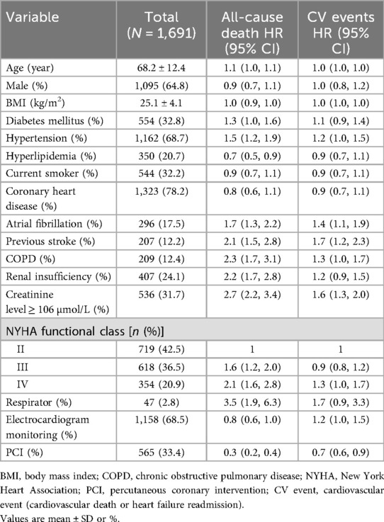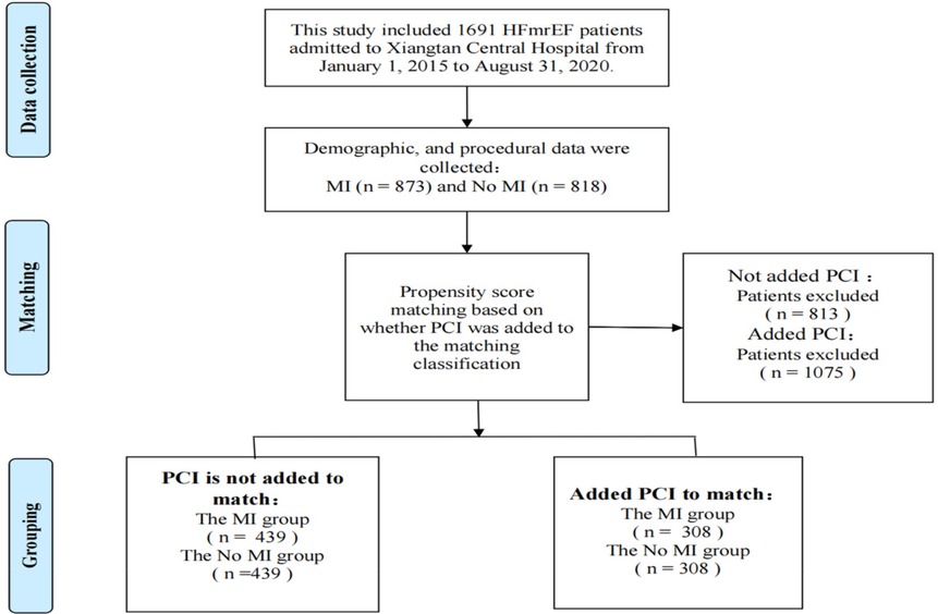 A total of 1,691 patients with HFmrEF were included in the study: 873 were diagnosed with MI, and 818 did not suffer from MI. Malignant tumors or other non-cardiac diseases with an expected survival time of less than 1 year were excluded from both groups. The primary endpoint of this study was all-cause mortality, and the secondary endpoints were cardiovascular (CV) events, defined as a composite of cardiovascular death and readmission for heart failure.