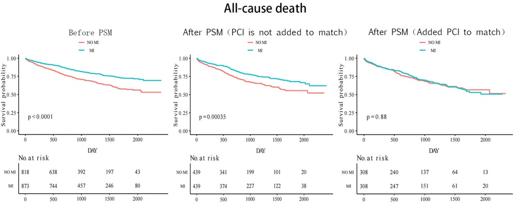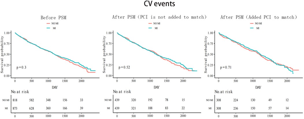 The median follow-up time was 33 months for both groups with and without myocardial infarction. Figure 2 shows that before the propensity score match, the Kaplan–Meier cumulative all-cause mortality was lower in the MI group than that in the non-MI group (P < 0.0001). After the first propensity score matching, the MI group still had lower all-cause mortality than that of the non-MI group (P = 0.00035). However, after the second addition of PCI for matching, all-cause mortality was similar in both groups (P = 0.88). CV events were similar between the two groups before and after matching. Before matching, the results revealed a statistically significant value of P = 0.3, whereas after the first matching, the P-value was 0.52, and after the second matching, it was 0.71 (Figure 3).