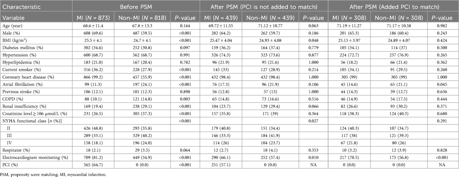 Table 2 shows the patient profiles before and after propensity score matching. Before propensity score matching, the patients in the MI group were more likely to be male (P < 0.001), to be current smokers (P < 0.001), and to have coronary heart disease (P < 0.001), electrocardiogram monitoring (P < 0.001), PCI (P < 0.001), and higher BMI values (P < 0.001). Compared with the MI group, the non-MI group had higher rates of atrial fibrillation (P < 0.001), COPD (P = 0.003), renal insufficiency (P < 0.001), and creatinine ≥106 µmol/L (P < 0.001), NYHA class III (P < 0.001), and NYHA class IV (P < 0.001). The two groups had patients with similar ages (68.6 ± 11.4 and 67.8 ± 13.3 with and without myocardial infarction, respectively, P = 0.164) and comparable rates of diabetes (P = 0.097), hypertension (P = 0.991), and hyperlipidemia (P = 0.997). 0.782), previous stroke (P = 0.898), and ventilator use (P = 0.064). Of the 439 matched pairs obtained after the first match, 290 in the MI group underwent PCI. However, the 308 matched pairs obtained after adding PCI for the second time to the matching group excluded all patients who underwent PCI. After the first and second propensity score matching, the two groups were well matched on parameters.