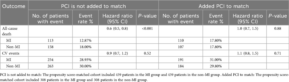 Table 3 presents the risk of primary and secondary outcomes in the propensity score-matched cohort. Without adding PCI to the matched 439 pairs, the MI group had 113 all-cause deaths (12.87%) compared with 158 all-cause deaths (18.00%) in the non-MI group (HR 0.6; 95% CI 0.5–0.8; P < 0.001). After adding PCI to the matched 308 pairs, there were 110 all-cause deaths (17.80%) in the MI group and 107 all-cause deaths (17.80%) in the non-MI group (HR 1.0; 95% CI 0.7–1.5; P = 0.88). In the first PSMA, CV events occurred in 254 patients (28.93%) with MI and 263 patients (30.00%) without MI (HR 0.9; 95% CI 0.7–1.2; P = 0.52). In the second PSMA (with PCI matched), CV events occurred in 191 patients (31.00%) with MI and 184 patients (29.80%) without MI (HR 1.1; 95% CI 0.8–1.5; P = 0.71).