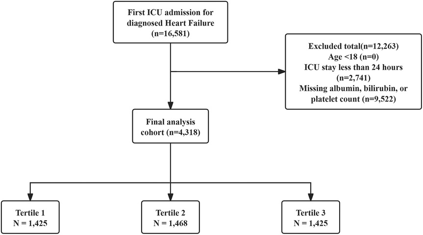 Patients included were those with a first ICU admission and a HF diagnosis identified using ICD-9 and ICD-10 codes. Exclusion was based on the following conditions: (1) patients aged less than 18 years at initial admission; (2) patients hospitalized in the ICU for under 24 h; (3) patients without key laboratory results (albumin, bilirubin, or platelet counts). In total, 4,318 patients were included in the study and categorized into three groups based on PALBI score tertiles. The patient selection process is illustrated in Figure 1.