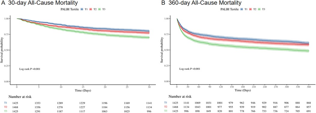 Figure 2 presents Kaplan–Meier survival curves depicting primary outcomes across different PALBI tertiles. Patients in the highest PALBI tertile exhibited significantly reduced survival probabilities at both 30 days (Figure 2A) and 360 days (Figure 2B) compared to those in the lowest tertile (log-rank test, p < 0.001).