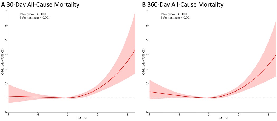 Figure 3. Restricted cubic spline (RCS) analysis of the association between PALBI score and 30-day (A) and 360-day (B) all-cause mortality.
