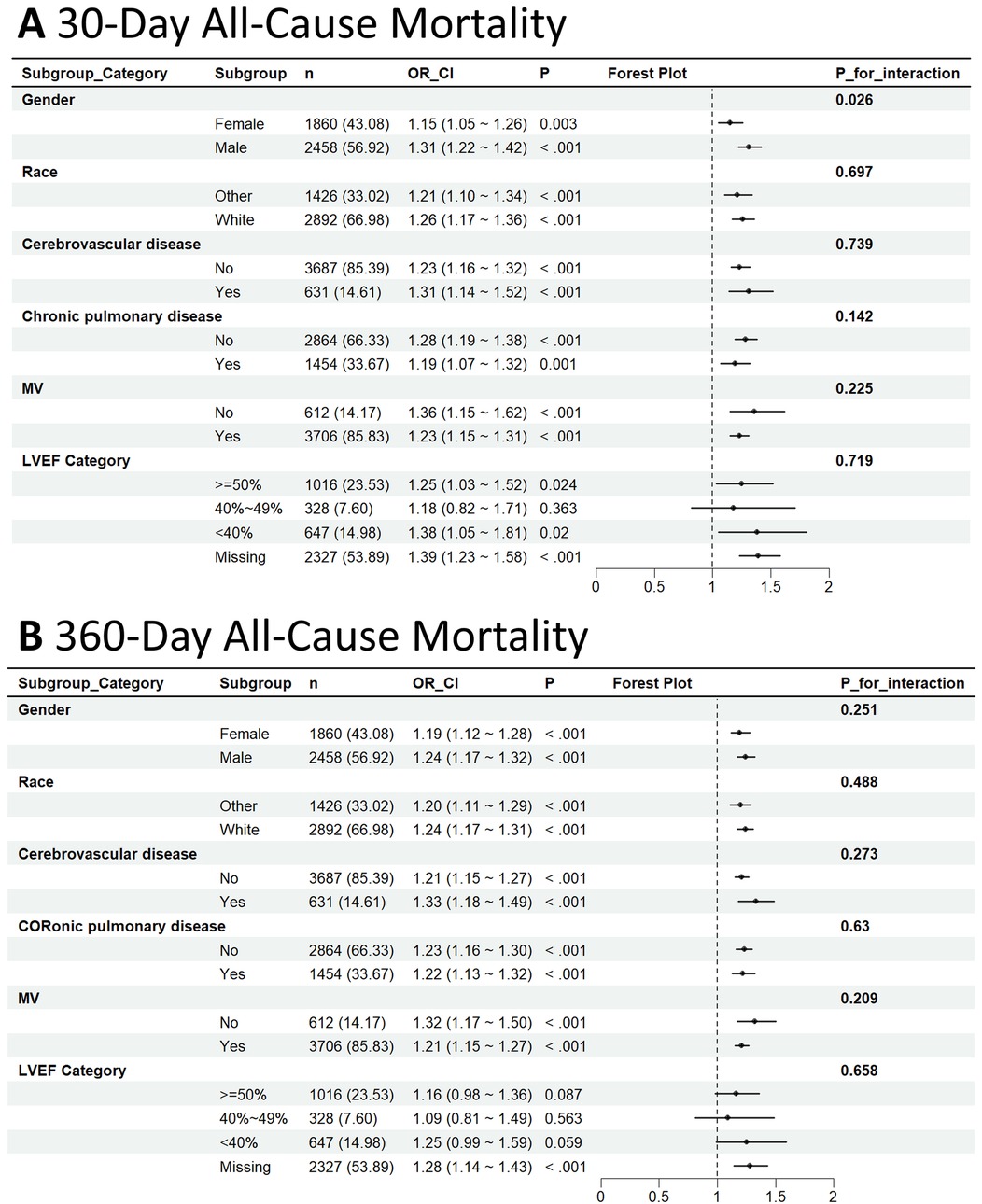 Among patients who died within 30 days, the association was more pronounced in males [HR = 1.31; 95% CI: 1.22–1.42] than in females [HR = 1.15; 95% CI: 1.05–1.26], with a statistically notable interaction by gender (interaction p-value = 0.026). Similar consistent trends were observed within the CeVD, COPD, and MV subgroups; however, no statistically significant interactions were identified, as all interaction p-values exceeded 0.05.