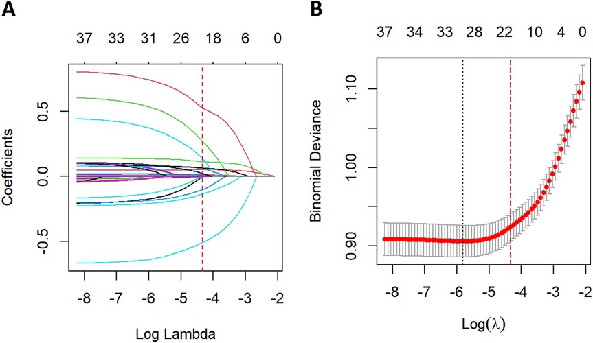The data were randomly split into training and validation sets in a 7:3 ratio. To manage a large number of features, the least absolute shrinkage and selection operator (LASSO) was used for feature selection in the training set. A five-fold cross-validation method was employed to determine the optimal regularization parameter. By shrinking coefficients, LASSO selects features with greater predictive contributions and eliminates redundant variables, thereby effectively achieving feature selection and dimensionality reduction.