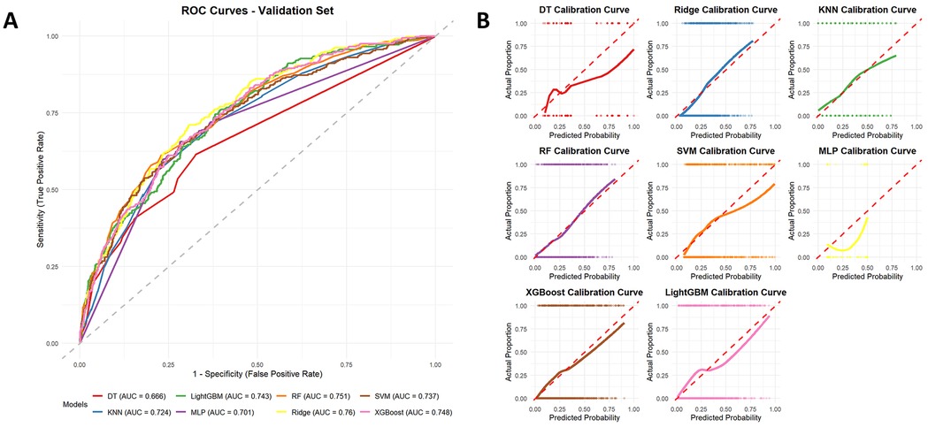Figure 6A displays the ROC curves corresponding to each machine learning algorithm, with performance assessed by the AUC. The AUC values were as follows: Ridge (0.760), RF (0.751), XGBoost (0.748), LightGBM (0.743), SVM (0.737), KNN (0.724), MLP (0.701), and DT (0.666). Figure 6B illustrates the calibration plots for each model evaluated on the test dataset. Calibration curves indicated that ensemble models (RF, XGBoost, and LightGBM) and Ridge provided closer agreement between predicted and observed probabilities. Based on the decision curve analysis shown in Supplementary Figure S1, most models, particularly Ridge, RF, XGBoost, and LightGBM, exhibited evident net clinical benefit across a wide range of threshold probabilities, suggesting strong potential for clinical applicability.