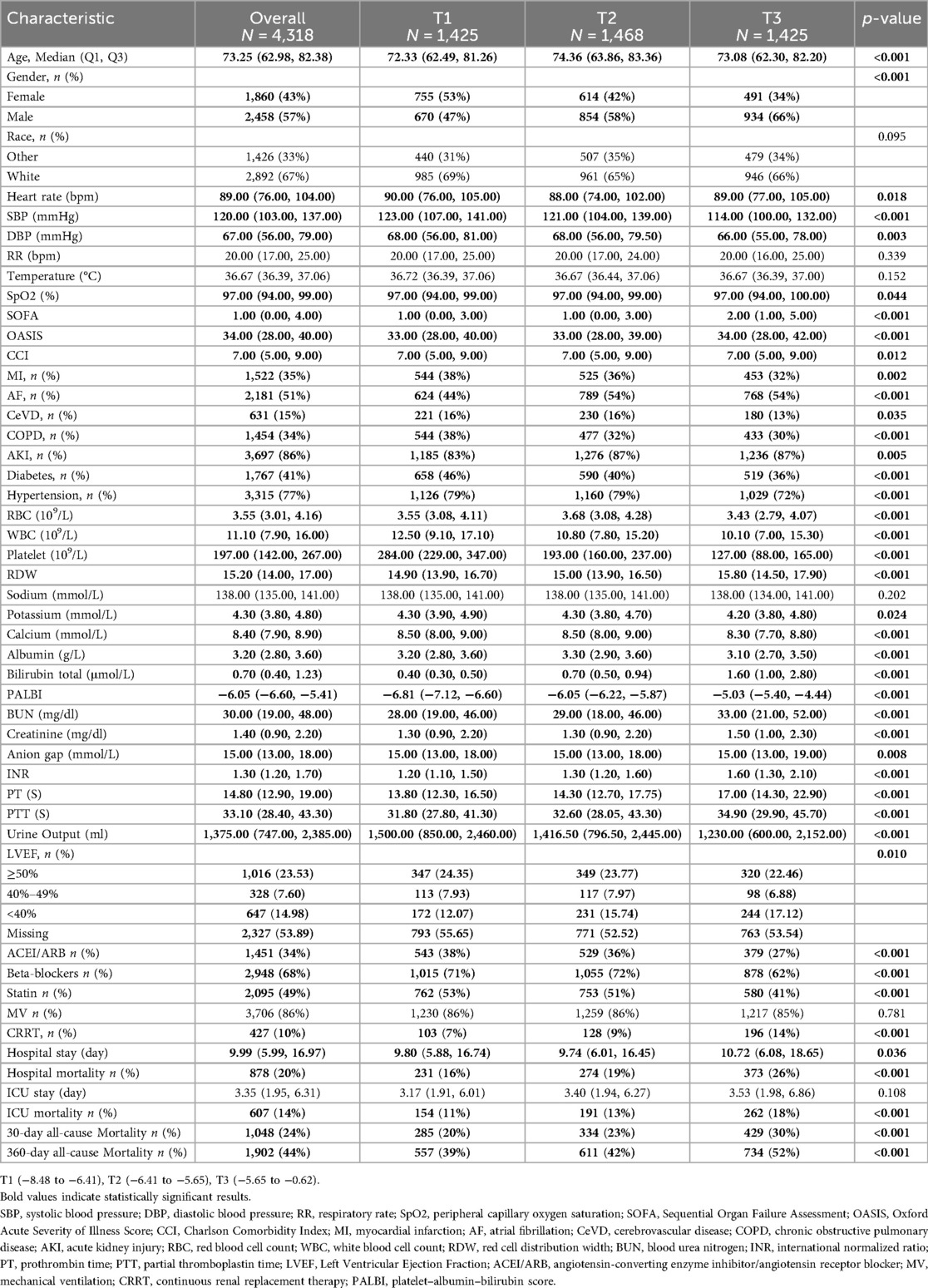 A total of 4,318 HF patients admitted to the ICU were included in the study. The median age was 73.25 years [interquartile range (IQR): 62.98–82.38], and 57% were male. The overall median PALBI score was −6.05 (IQR: −6.60 to −5.41). The all-cause mortality rates at 30 and 360 days were observed to be 24% and 44%, respectively (Table 1).