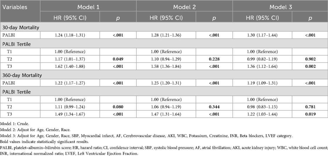 Cox proportional hazards models were used to calculate hazard ratios (HRs) and 95% confidence intervals (CIs) to assess the relationship between PALBI scores and overall mortality, with adjustments for potential confounding factors. Variables with p < 0.05 in univariate analysis were included in the multivariate analysis. Clinically relevant variables with significant prognostic implications were also included in multivariate models as follows: Model 1 included no covariate adjustments; Model 2 accounted for age, gender, and race; Model 3 incorporated additional adjustments for age, gender, race, SBP, MI, AF, CeVD, AKI, WBC count, serum potassium, creatinine, INR, beta-blocker use, and LVEF categories.