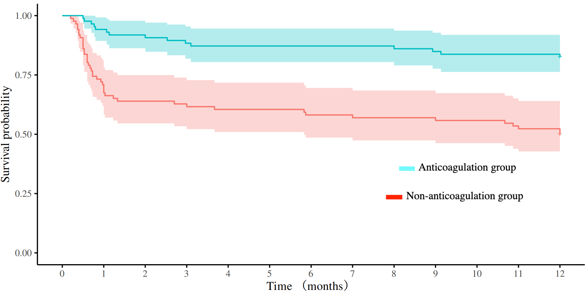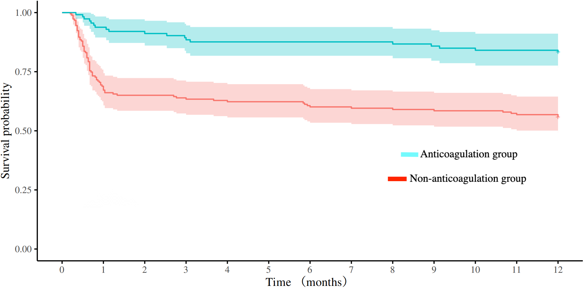 Prognostic outcomes between the anticoagulation and non-anticoagulation groups before PSM.