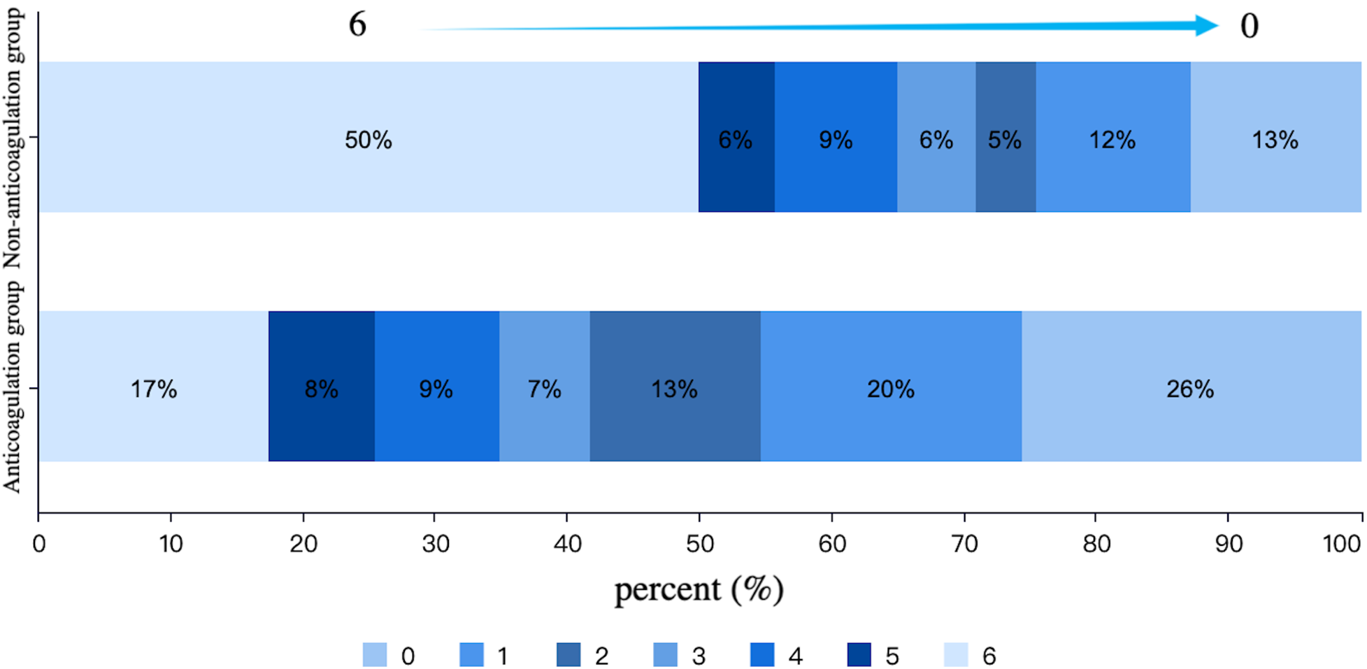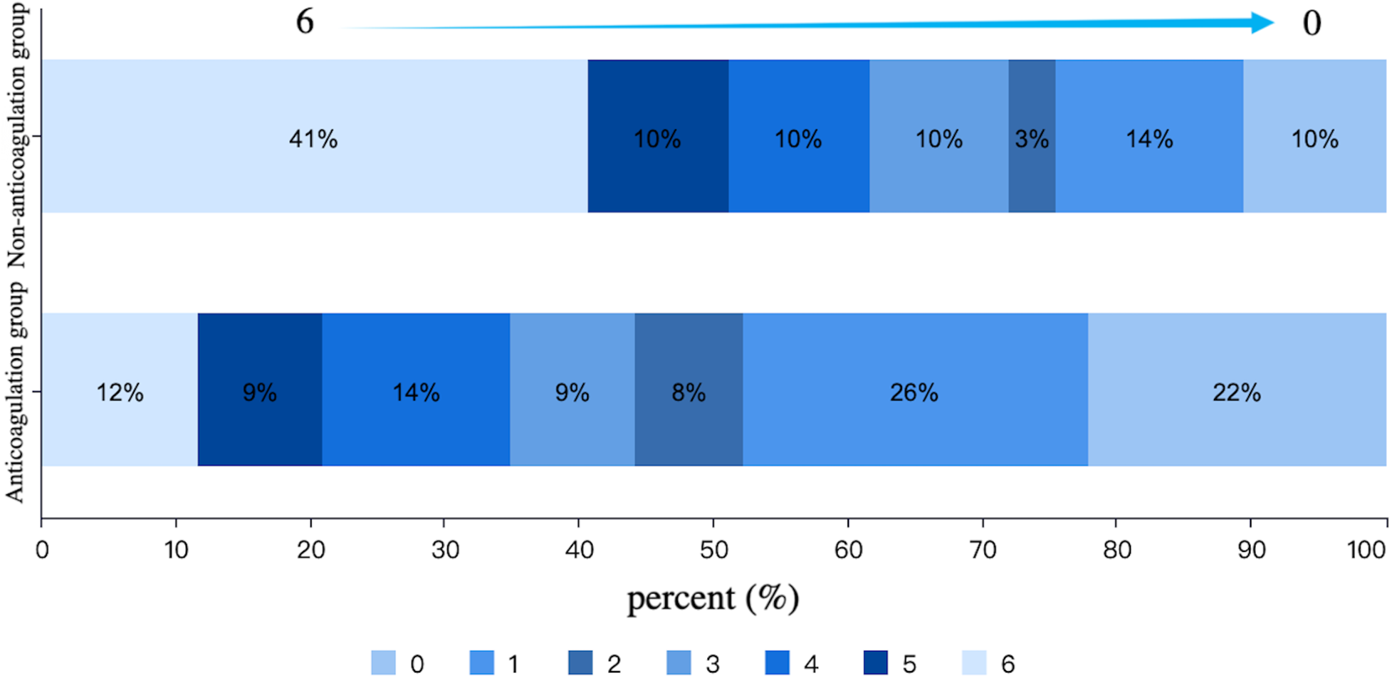 This study included 296 patients with complete follow-up, stratified into anticoagulation (n = 113, 38.18%) and non-anticoagulation (n = 183, 61.82%) groups. Percentage of patients who were on anticoagulants at the time of hospital discharge was 5.31% (n = 6) on Edoxaban, 60.18% (n = 68) on Rivaroxaban and 34.51% (n = 39) were on Dabigatran Etexilate (Supplementary Table S2). Additional details regarding the timing of anticoagulation initiation (Supplementary Table S1) and antiplatelet medications (Supplementary Table S3) are provided in the Supplementary Materials. The median admission NIHSS scores (16 vs. 18, P = 0.043), discharge NIHSS scores (6 vs. 13, P < 0.001), discharge mRS scores (3 vs. 4, P < 0.001) and the incidence of postoperative HT (12.39% vs. 31.69%, P < 0.001) were significantly higher in the non-anticoagulation group. Additionally, the anticoagulation group had a higher LVEF (54.81% vs. 53.32%, P = 0.026) than the non-anticoagulation group. Furthermore, there was a significant difference in infarct size between the two groups (P = 0.002), with the anticoagulation group demonstrating smaller infarct areas (Table 1).