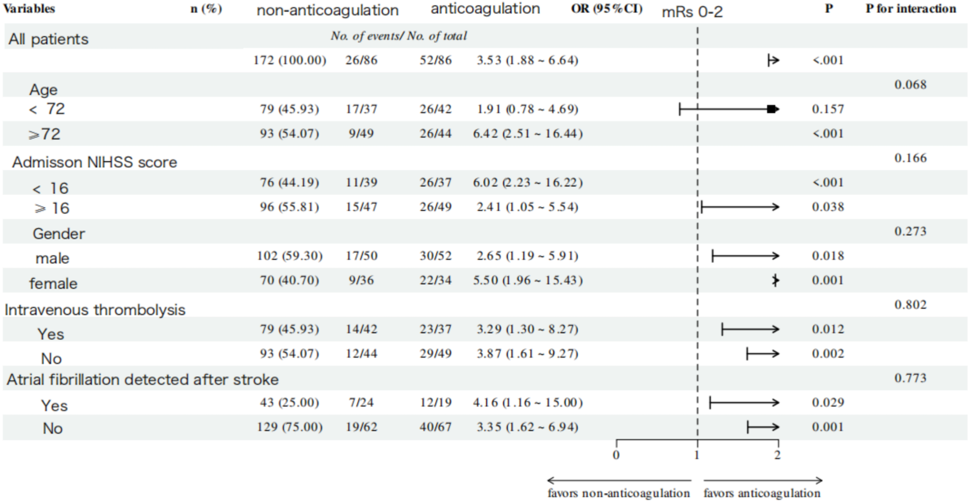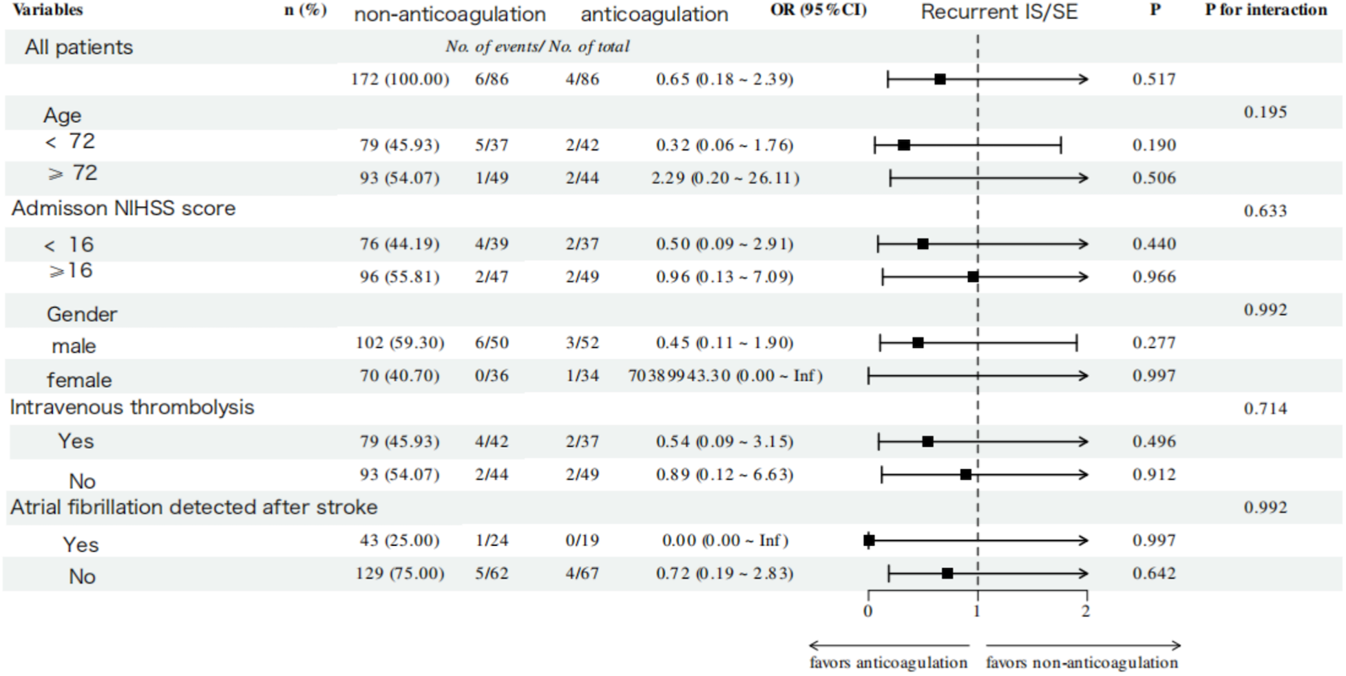Post-PSM cohort stratification was performed using median-based cutoffs: age (<72 vs. ≥72 years), baseline NIHSS score (<16 vs. ≥16), and atrial fibrillation classification [atrial fibrillation detected after stroke (AFDAS) vs. known atrial fibrillation (KAF)]. Subgroup analyses stratified by age, sex, AF classification, admission NIHSS score, and IVT coadministration status were conducted to evaluate the relationship of anticoagulant therapy with 1-year functional outcomes and recurrent IS/SE events. All baseline admission data were included in a univariate analysis. Subsequently, factors significantly associated with a good functional outcome (mRS 0–2) at a significance level of P < 0.05 were incorporated into a multivariate analysis to calculate the odds ratio (OR) and 95% confidence interval (CI) for the association between anticoagulant therapy and functional outcomes. The analysis and processing of the data in this study was completed in SPSS 27.0 software and Zstatsv1.0 software.