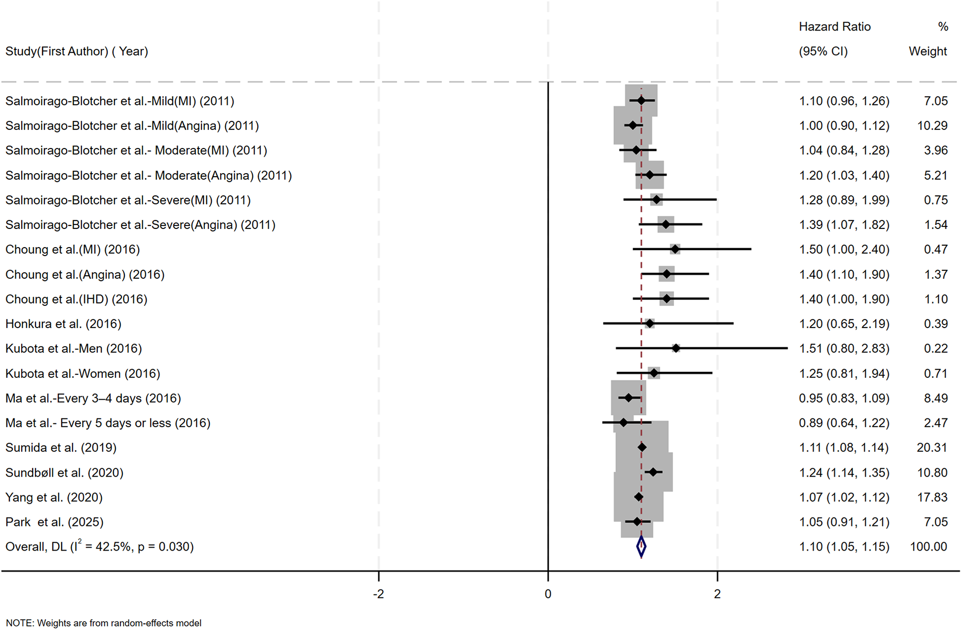 Nine studies involving 283,070 constipation cases and 3,343,120 controls were analyzed. Constipation was associated with a 10% increased CHD risk [hazard ratio (HR] = ).10, 95% confidence interval (CI): 1.05–1.15]. Statistical heterogeneity (I2 = 42.5%, p = 0.03) was observed in the present study. Subgroup analyses revealed a stronger association with myocardial infarction (HR = 1.14, 95% CI: 1.05–1.23). Notably, constipation showed no CHD risk elevation in women (HR = 1.04, 95% CI: 0.98–1.11), with reduced residual heterogeneity (I2 = 30.2%, p = 0.177).