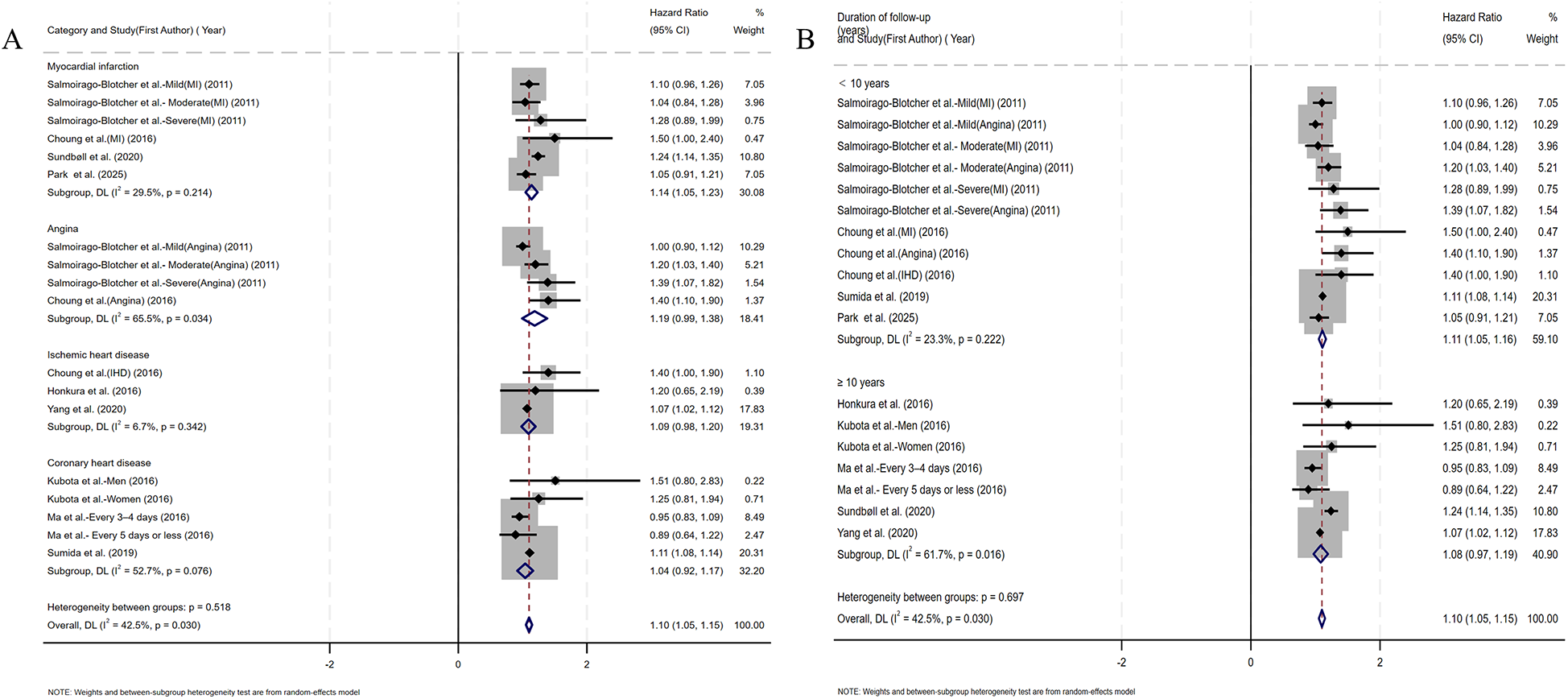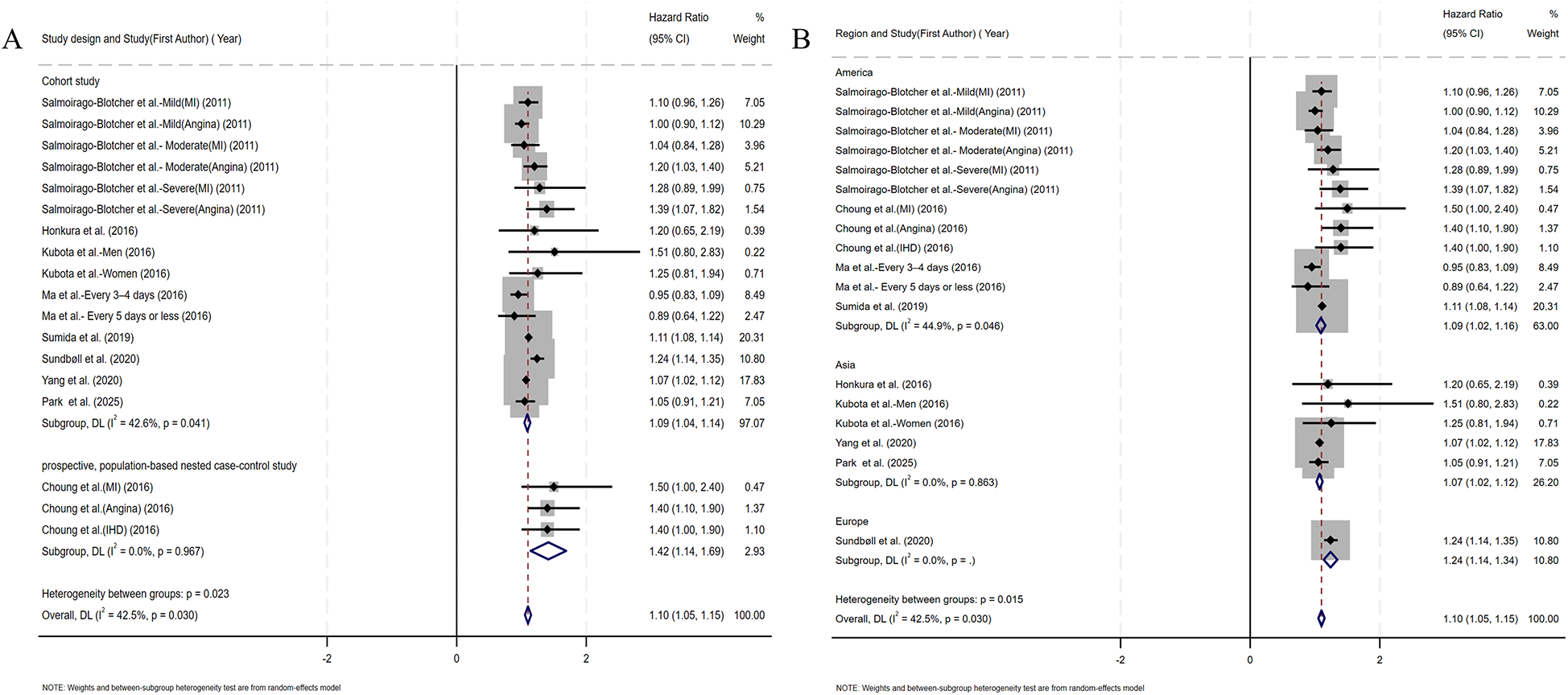 Figure 2 presents the multivariable-adjusted hazard ratios (HRs) for CHD risk associated with constipation across included studies. Pooled analysis demonstrated a statistically significant 10% increased CHD risk among constipated participants vs. controls (HR=1.10, 95% CI: 1.05–1.15). Three studies reporting solely ORs were excluded from primary analysis due to the inherent limitations of ORs in causal inference. However, a meta-analysis incorporating these OR-based and HR-based studies (total N = 12) demonstrated strengthened pooled effect estimates for the constipation–CHD risk association (OR=1.12 vs. 1.10 in primary analysis), suggesting potential underestimation in our original model (Supplementary Figure S1). Moderate heterogeneity was detected (I2 = 42.5%, p = 0.03), with Galbraith plot analysis identifying potential outlier studies contributing to between-study variation (Figure 7A). To evaluate potential study design effects, we performed subgroup analyses stratified by study type. Cohort studies demonstrated a robust association between constipation and elevated CHD risk (HR=1.09, 95% CI: 1.04–1.14), as illustrated in Figure 3A. Geographic subgroup analyses revealed significantly elevated CHD risk associated with constipation across all regions: Americas (HR=1.09, 95% CI: 1.02–1.16), Asia (HR=1.07, 95% CI: 1.02–1.12), and Europe (HR=1.24, 95% CI: 1.14–1.34), as shown in Figure 3B.