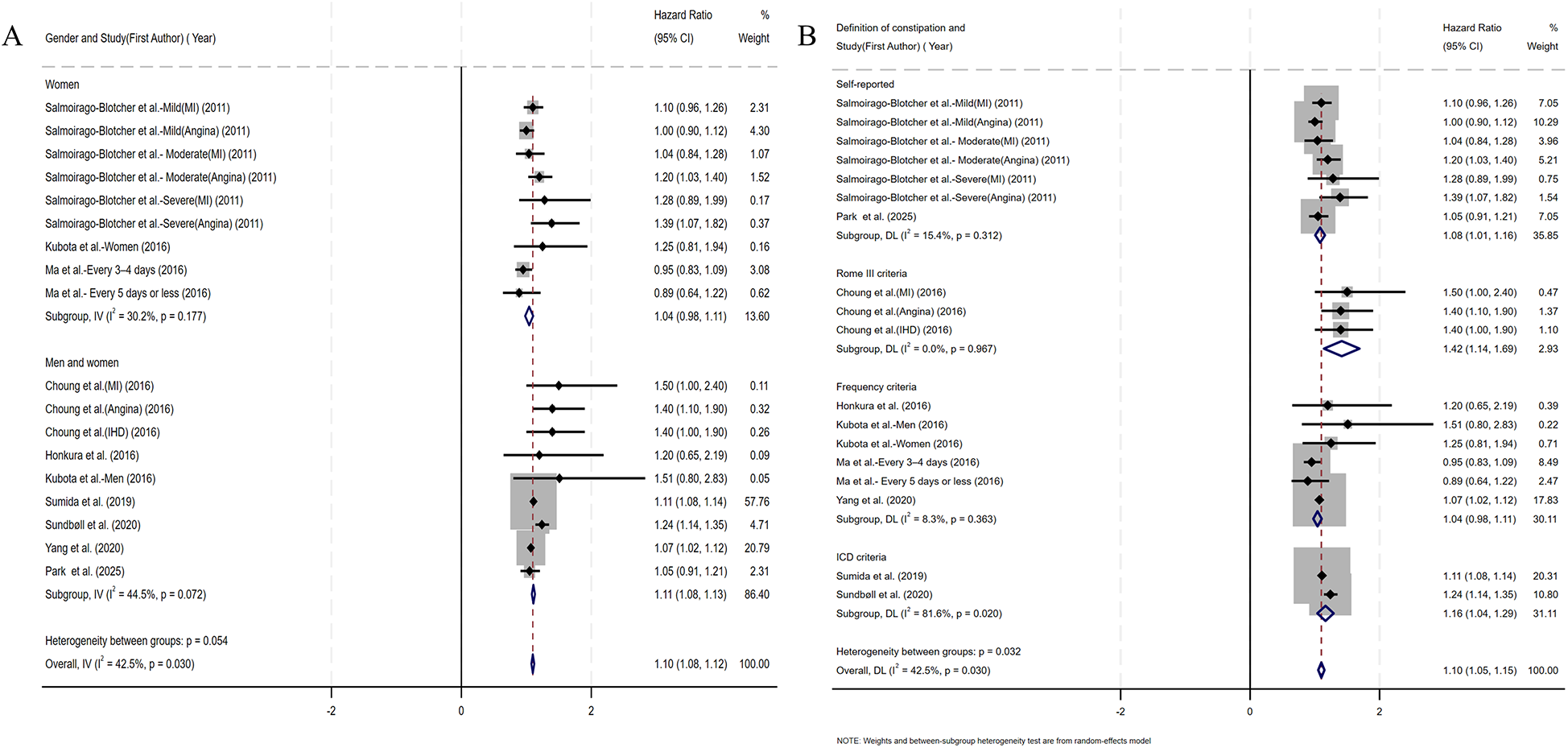 Coronary artery obstruction represents only one component in the multifactorial pathogenesis of ischemic heart disease, yet most prior studies have not rigorously differentiated ischemic heart disease from CHD terminologically (17). Accordingly, we adopted an operational classification strategy that aligned subgroup definitions with the specific nomenclature used by the original investigators. Subgroup analysis by CHD category demonstrated a significant association between constipation and myocardial infarction risk (HR=1.14, 95% CI: 1.05–1.23). No significant associations were observed for angina pectoris, ischemic heart disease, or coronary heart disease (Figure 4A). Given the substantial reduction in heterogeneity (I2 < 25%) within the ischemic heart disease subgroup, we performed additional fixed-effect meta-analysis. This analysis confirmed a significant constipation–ischemic heart disease association (HR=1.07, 95% CI: 1.02–1.12), as detailed in Supplementary Figure S2. Stratified by follow-up duration, constipated individuals with <10 years of follow-up demonstrated significantly elevated CHD risk (HR=1.11, 95% CI: 1.05–1.16), whereas no statistically significant association emerged in cohorts with ≥10 years of surveillance (HR=1.08, 95% CI: 0.97–1.19) (Figure 4B). Given the sex-specific design of included studies, we conducted sex-stratified analyses evaluating constipation–CHD associations. The female-specific analysis revealed a non-significant association (HR=1.04, 95% CI: 0.98–1.11) with reduced residual heterogeneity (I2 = 30.2%, p = 0.177), as detailed in Figure 5A. Of the nine cohort studies included in the analysis, only one provided sex-stratified risk estimates specific to male patients, which precluded a meaningful subgroup analysis for this population. Recognizing that heterogeneous definitions of constipation could introduce substantial variability into the pooled estimates, we performed a subgroup analysis stratified by the specific diagnostic criteria used to define constipation across the included studies (Figure 5B). Our results showed that patients diagnosed with constipation according to self-reported constipation (via validated questionnaires or patient interviews), Rome III criteria, and ICD criteria have a significantly increased risk of CHD (HR=1.08, 95% CI: 1.01–1.16; HR=1.42, 95% CI: 1.14–1.69; HR=1.16, 95% CI: 1.04–1.29). In the subgroup diagnosed with constipation according to frequency criteria, although heterogeneity was significantly reduced, constipation was not observed to increase CHD risk (HR=1.04, 95% CI: 0.98–1.11).