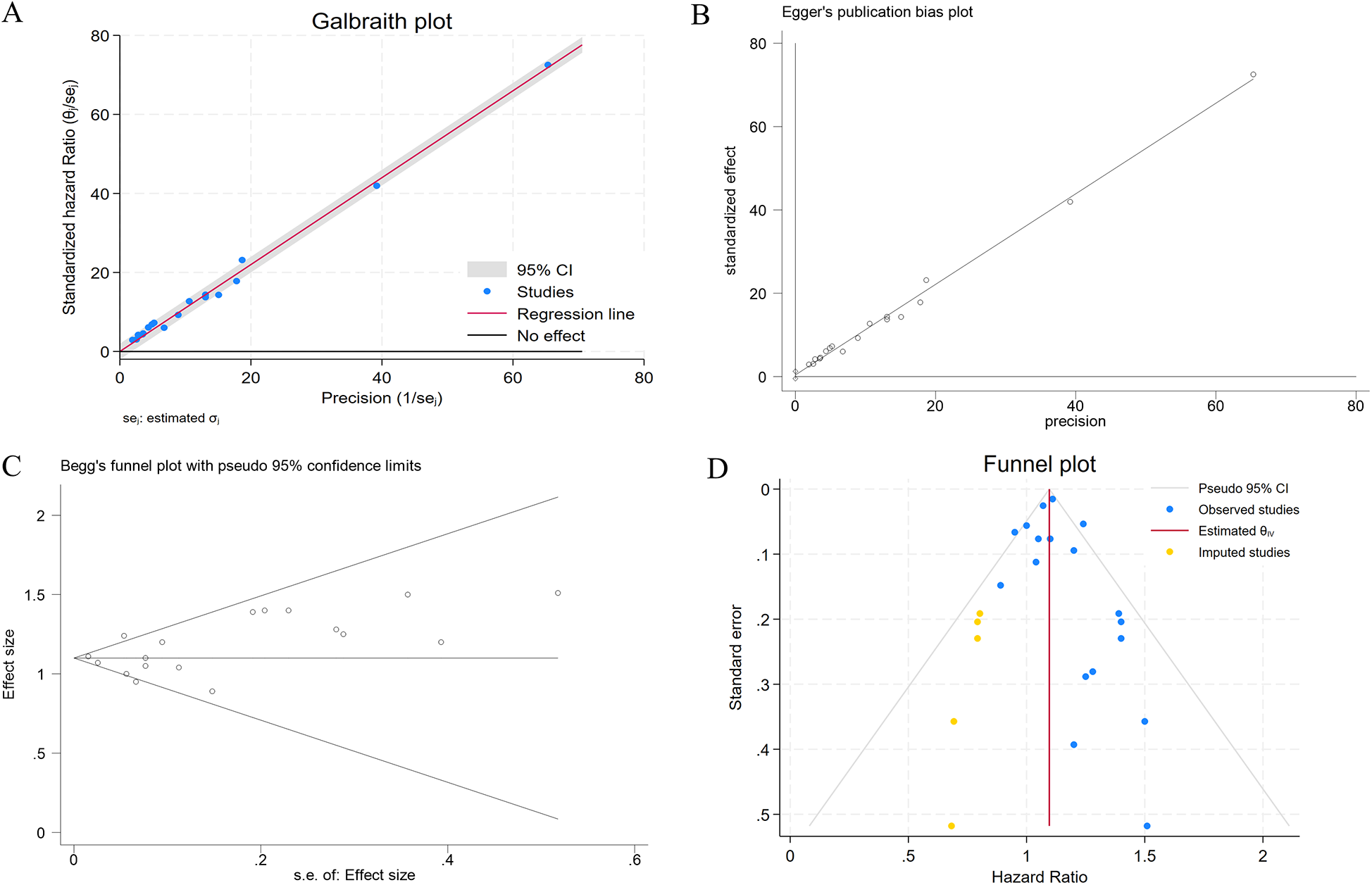 (A) The Galbraith plot regarding the primary source of heterogeneity; (B) evaluation of publication bias using Egger's test; (C) evaluation of publication bias using Begg's funnel plot; (D) adjusted funnel plot based on the non-parametric trim-and-fill analysis of publication bias.