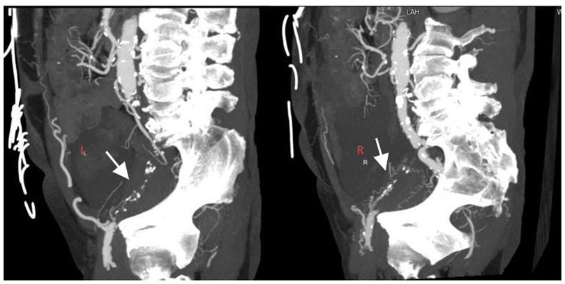 A 74-year-old male was admitted to the hospital due to intermittent chest tightness lasting for 4 years, which had worsened over the past month. The patient has a history of hypertension for more than 10 years. Physical examination of the heart and lungs reveals no abnormalities. On 21 January 2025, coronary angiography performed at an outside hospital revealed 70%–80% stenosis of the left main terminal segment, 60%–70% stenosis in the proximal-to-mid left anterior descending artery (LAD), 99% ostial stenosis of the left circumflex artery (LCX), and complete mid-to-distal occlusion of the right coronary artery (RCA). Echocardiography showed left-ventricular segmental wall-motion abnormalities with an ejection fraction of 40%. Upper-extremity color Doppler ultrasound was normal, whereas lower-extremity computed tomography angiography (CTA) demonstrated bilateral external iliac artery occlusion (Figure 1). Diagnosis: Coronary atherosclerotic heart disease, unstable angina, NYHA functional class II, bilateral external iliac artery occlusion. The patient's coronary artery disease is complex, and the access route for interventional therapy is restricted. Coronary artery bypass grafting is recommended, but the patient refuses. Our treatment plan is to first address the occluded RCA and then schedule the treatment of the non-occluded LCA at a later date. This is because the RCA serves as the recipient vessel, while the LCA acts as the donor vessel providing collateral circulation to the RCA. This approach can reduce the intraoperative risks for the patient.