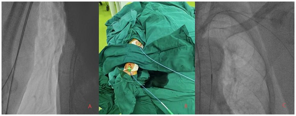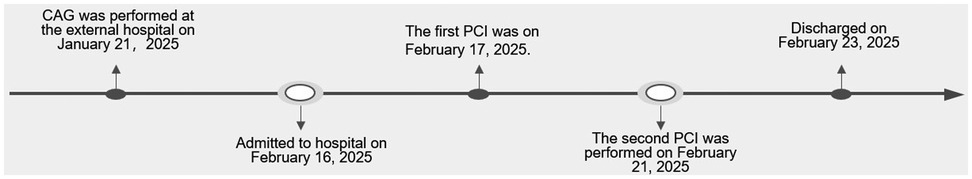 The surgical procedure: On February 17, 2025, PCI was performed on the patient with the assistance of IABP. First, punctures were made in the right radial artery and brachial artery, and 6F and 7F arterial sheaths were inserted, respectively (Figures 2A,B). Then, an IABP was placed through the left brachial artery (Figure 2C). A guiding catheter 1 was advanced through the right brachial artery sheath to the ostium of the RCA, and another guiding catheter 2 was advanced through the right radial artery sheath to the ostium of the left main trunk for bilateral angiography (Figure 3A), clearly visualizing the course of the distal RCA. Under the support of microcatheter 1, five guide wires (guide wires 1 and 2: SION Blue AHW14R004S, Asahi; guide wire 3: XT-A APW14R009S, Asahi; guide wires 4 and 5: Gaia First AHW14R007P, Asahi) were sequentially used, but none could cross the occluded segment in the mid-RCA (Figure 3B).Under the support of microcatheter 2, guide wire 2 was advanced through the septal branch–posterior descending (PD) collateral in a retrograde manner into the distal segment of the RCA via guiding catheter 2. Subsequently, guide wires 6, 7, 8, and 9 were sequentially advanced through microcatheter 2 to attempt retrograde recanalization. Guide wire 9 successfully traversed the occluded mid-RCA segment and reached the RCA ostium (Figure 3C). Balloon 2 was used to compress the guide wire, and microcatheter 1 was withdrawn. The extension catheter was advanced into the proximal segment of the RCA through guide catheter 1. Microcatheter 2, along with guide wire 9, was advanced into the extension catheter in the RCA. Guide wire 10 was exchanged in reverse through guide catheter 1. Through guide catheter 1, guide wire 11 was inserted into microcatheter 2. Guide wire 11 was then advanced through microcatheter 2 to the distal segment of the RCA, after which microcatheter 2 was withdrawn. Over guide wire 11, the lesion was pre-dilated sequentially with a balloon, and an Intravascular Ultrasound (IVUS) catheter was advanced to the distal segment of the RCA and pulled back to assess the lesion and guide stent placement. Eventually, four drug-coated stents were successfully implanted (Figure 3D). IVUS assessment showed good stent apposition. Repeat angiography revealed no residual stenosis within the stent and no occlusion of major branches. The procedure proceeded smoothly without any intraoperative complications. On February 21st, the patient underwent left coronary artery intervention again. Two drug-coated stents were implanted in the LM-LAD, and Drug-coated balloon (DCB)dilation was performed in the LCX (Figures 3E,F). The wound healed well after the procedure, and the patient was discharged two days later. After 12 weeks of follow-up, the patient reported no discomfort, and blood circulation in both upper limbs was good. The patient's hospitalization timeline is shown in Figure 4.