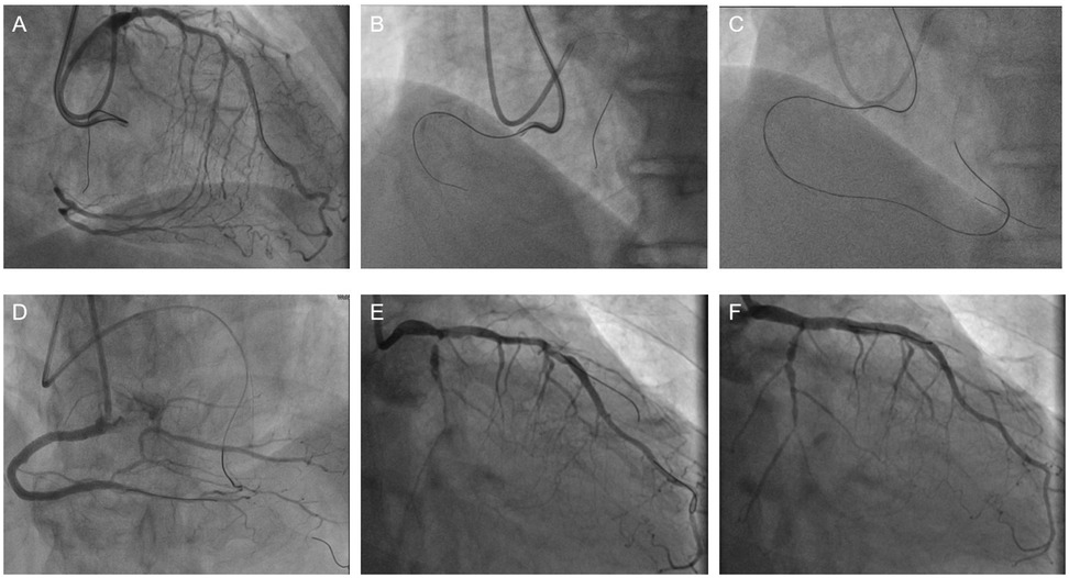 Figure 3. A Bilateral angiography demonstrating total occlusion of the proximal RCA and critical stenosis of the left main coronary artery. (B) Failed anterograde guidewire crossing through the RCA occlusion. (C) Retrograde recanalization achieved via septal collateral channels. (D) Final angiographic result after deployment of four drug-eluting stents in the RCA, with restored TIMI grade 3 flow. (E) CAG indicates severe stenosis of the LCA. (F) The image of successful stent implantation in the LCA.