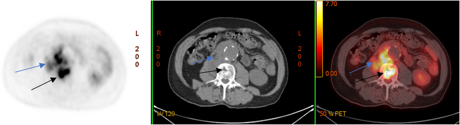 18F-FDG PET/CT (axial slices) demonstrates the presence of a metabolically active retroperitoneal infiltrate with extension to the right m. psoas (blue arrows) and lumbar vertebral bodies (black arrows).