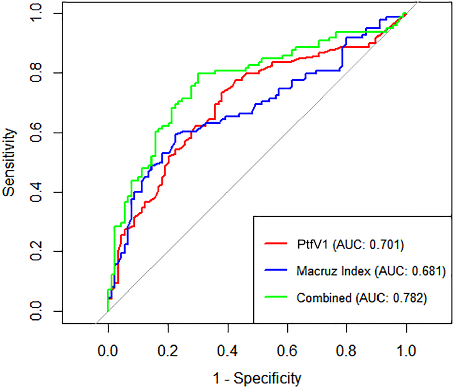 Statistical analyses and data entry were performed using SPSS version 27.0. Continuous variables with normal distribution were expressed as mean ± standard deviation (M ± SD) and compared using independent t-tests or analysis of variance (ANOVA), while categorical variables were presented as percentages and analyzed using chi-square (χ2) tests. Variables demonstrating statistically significant differences between groups were selected as predictors for multivariable logistic regression analysis, which included gender, BMI, AHI, LAD, SpO2, PWD, PtfV1, and the Macruz Index. The specific PWPs, PtfV1 and Macruz Index, were visualized using box plots to examine their distributions, followed by an evaluation of their predictive value for complex atrial arrhythmias through receiver operating characteristic (ROC) curve analysis, quantified by the area under the curve (AUC). Based on the optimal cut-off values derived from the ROC analysis, positive predictive value (PPV) and negative predictive value (NPV) were calculated. A p-value of less than 0.05 was considered statistically significant.