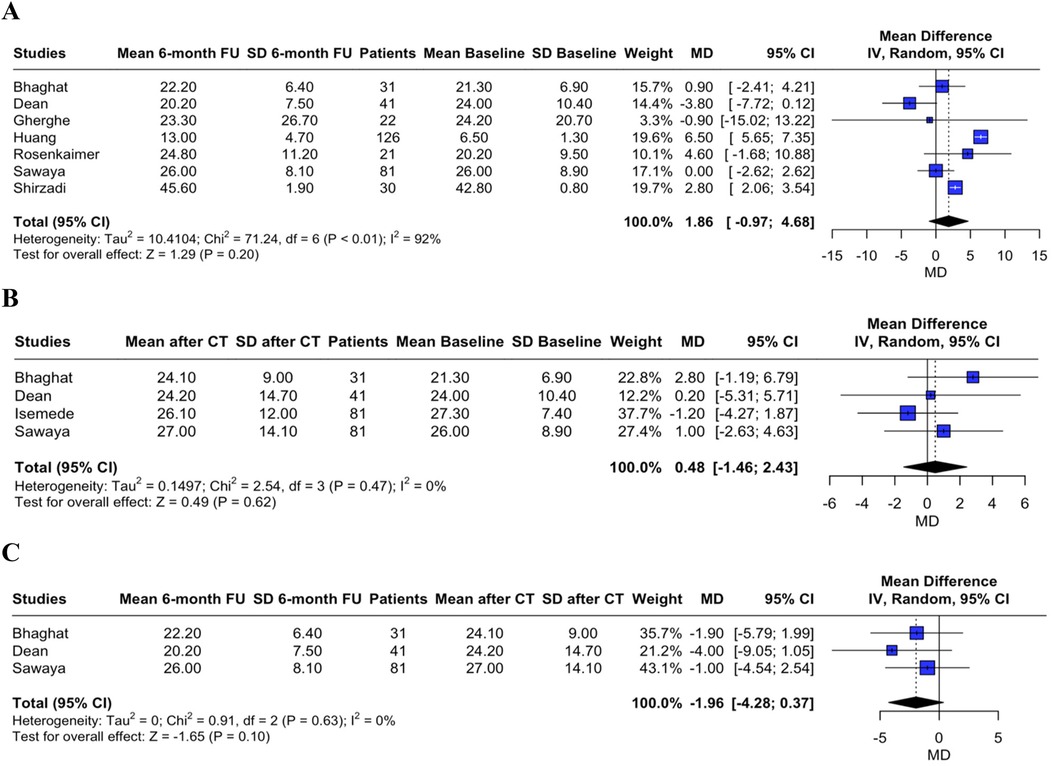 This systematic review and meta-analysis was performed in accordance with the Cochrane Collaboration and the Preferred Reporting Items for Systematic Reviews and Meta-Analysis (PRISMA) statement guidelines (18). Biomarker measurements were evaluated longitudinally at three time points: T0 (baseline), T1 (post-chemotherapy completion), and T2 (3–6 months of follow-up). In this meta-analysis, we utilized the mean difference (MD) as the effect measure to quantify changes in sST2 levels between T0, T1 and T2, among patients exposed to cardiotoxic therapies. The choice of MD was based on the uniformity of measurement units and scales for sST2 across the included studies, allowing for direct comparison of absolute differences. To account for potential heterogeneity among studies, arising from variations in patient populations, study protocols, and follow-up durations, we employed a random-effects model. This approach assumes that the true effect size may vary across studies and provides a more conservative estimate, thus enhancing the generalizability of the findings. The common-effects model is presented in the forest plots as a sensitivity analysis. Given that biomarker measurements are continuous outcomes, they were transformed to mean and standard deviation by the method proposed by Wan et al. when needed (19). Subsequently, the restricted maximum-likelihood estimator (REML) method was applied to reduce variance bias, and the MD among T0, T1, and T2 was computed (20). Cochran Q test and I2 statistics were used to assess heterogeneity; P values inferior to 0.10 and I2 > 25% were considered significant for heterogeneity.