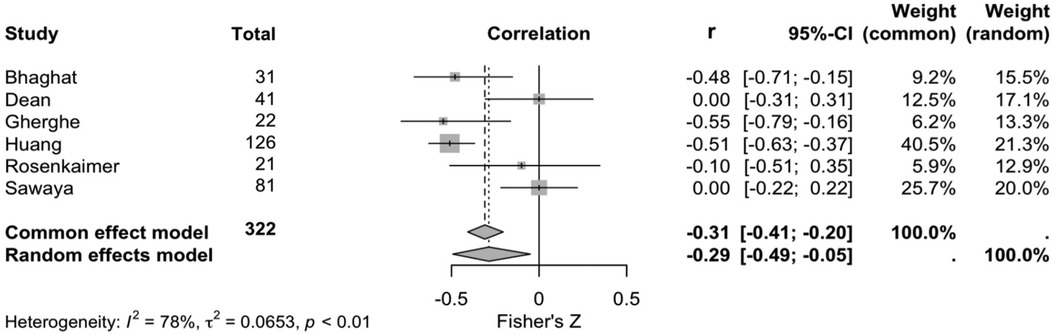 Six studies explored the correlation between sST2 and cardiotoxicity development. Cardiotoxicity definitions are reported in Supplementary Table S2. According to a random effects model (and common effects model as a sensitivity analysis), there was a negative correlation between sST2 levels and left ventricular ejection fraction (r −0.29, 95% CI, −0.49- −0.05, p < 0.010, I2 = 78%, Figure 2).