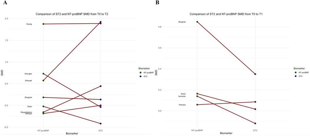 Figure 4. Comparison of NT-proBNP and sST2 standard mean differences between T0 and T2 (panel A), and T0 and T1 (panel B).