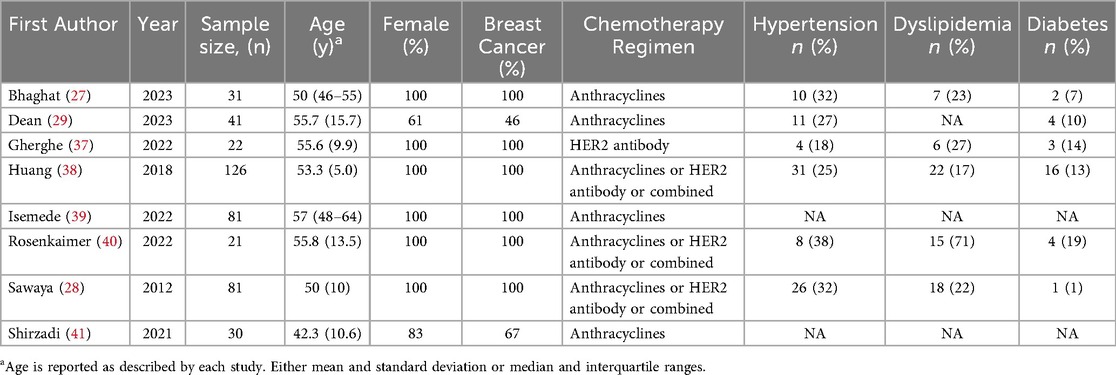 The study and baseline characteristics of the included subjects are reported in Table 1. The median age ranged from 42 to 57 years. Six studies enrolled only women with breast cancer, while two studies enrolled 61% and 83% women with breast cancer accounting for 46% and 67% of enrolled patients, respectively. All the studies included patients treated with anthracyclines and/or HER-2 antibodies. Given the relevance of cardiovascular risk factors in high-risk individuals identification, we reported hypertension, dyslipidemia, and diabetes prevalence in Table 1.
