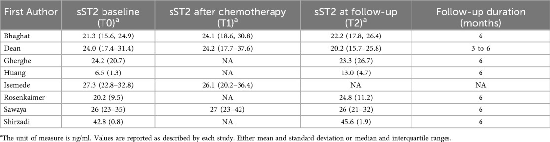 sST2 was measured by different assays among studies, which are reported in Supplementary Table S3. All studies reported sST2 baseline values. Four studies reported sST2 values after chemotherapy completion. Seven studies reported sST2 values at follow-up. Among these, six studies had 6-month follow-up, while one study had 3–6-month follow-up. The absolute values of sST2 across the three time points (T0, T1, and T2) are summarized in Table 2.