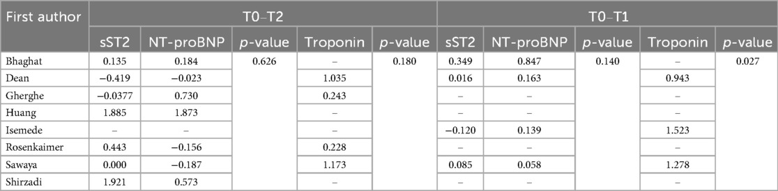 Table 3. Standard mean difference for sST2, NT-proBNP, and troponin at T0–T2 and T0–T1. P-values are expressions of differences between sST2 and NT-proBNP standard mean difference first and between sST2 and Troponin standard mean difference second.