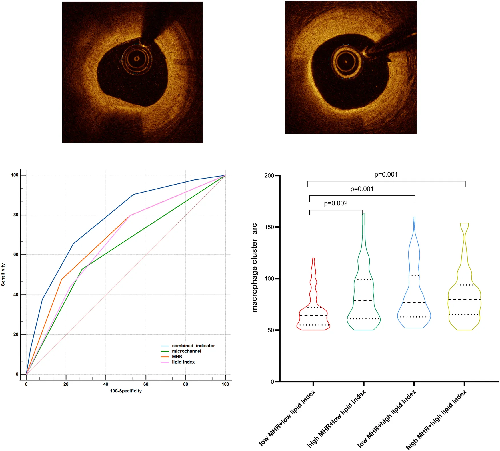 Table 2 summarizes the OCT analysis of culprit vessels. Patients with macrophage clusters showed a larger lipid index, thinner fibrous cap thickness (FCT), more plaque rupture, layered plaque, TCFA, cholesterol crystals, and microchannels compared to those without macrophage clusters, but no differences in thrombus, minimal lumen area, calcification index, calcification thickness, and calcification types.