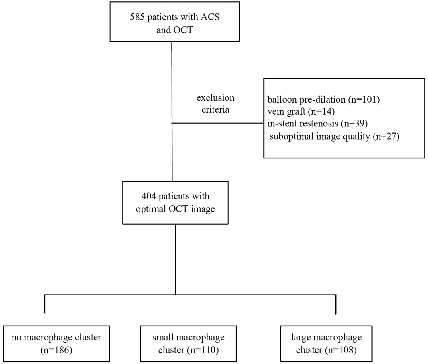 In this retrospective, single-center study, 585 patients presenting ACS who underwent an OCT examination during a clinically indicated coronary angiogram between Jan 2021 and Jan 2023 were identified in Tianjin Chest Hospital (Tianjin, China). Patients with OCT evaluation of the culprit vessel after balloon pre-dilation [n = 101, 48 for ST-segment elevation myocardial infarction (STEMI), 40 for non-ST-segment elevation myocardial infarction (NSTEMI), and 13 for unstable angina pectoris (UAP)], vein graft (n = 14), in-stent restenosis (n = 39), or suboptimal image quality (n = 27) were excluded. Finally, 404 patients were included in the present study (Figure 1). This retrospective study complied with the Declaration of Helsinki and was approved by the Ethics Committee of the Institute of Tianjin Chest Hospital. The data are anonymous, and the requirement for informed consent was therefore waived.