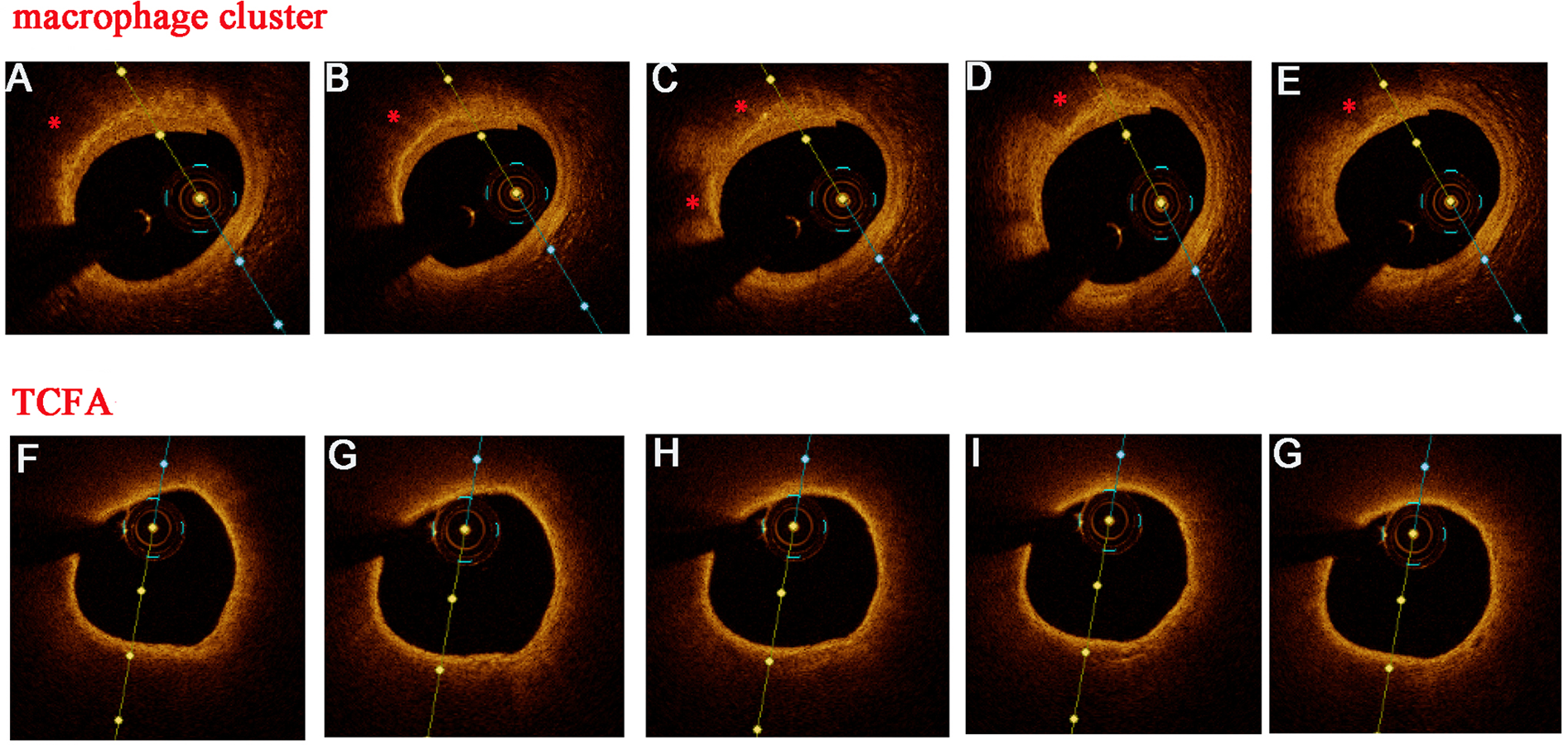 Discrimination between macrophage clusters (*) and TCFA in consecutive OCT images. Several OCT features supported superficial macrophage accumulation instead of TCFA: well-delineated, sharp radial borders, visualized underlying tissue in several adjacent frames, and a rapid change in appearance from frame to frame (A–E). In contrast, this were no sharp radial borders and rapid changes from frame to frame (F–G) in TCFA.