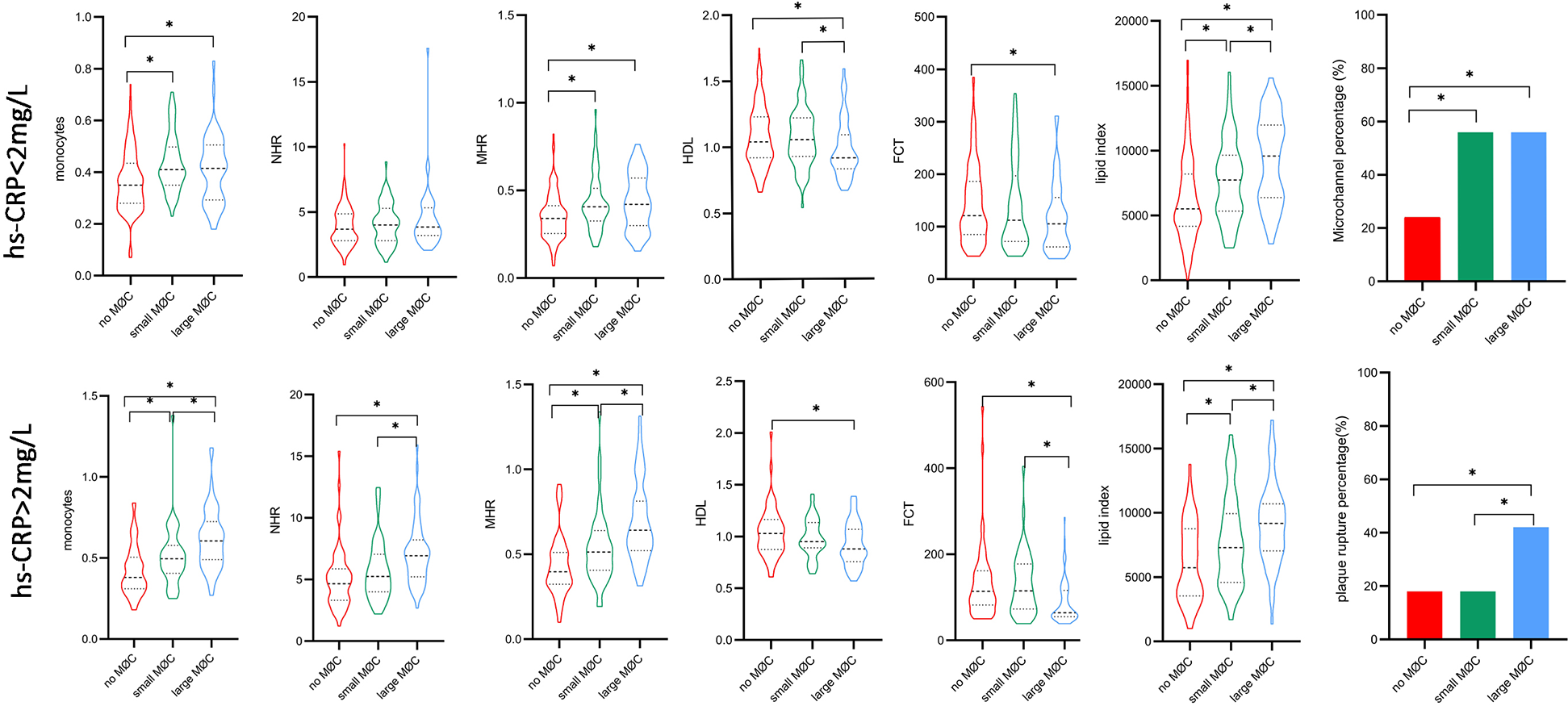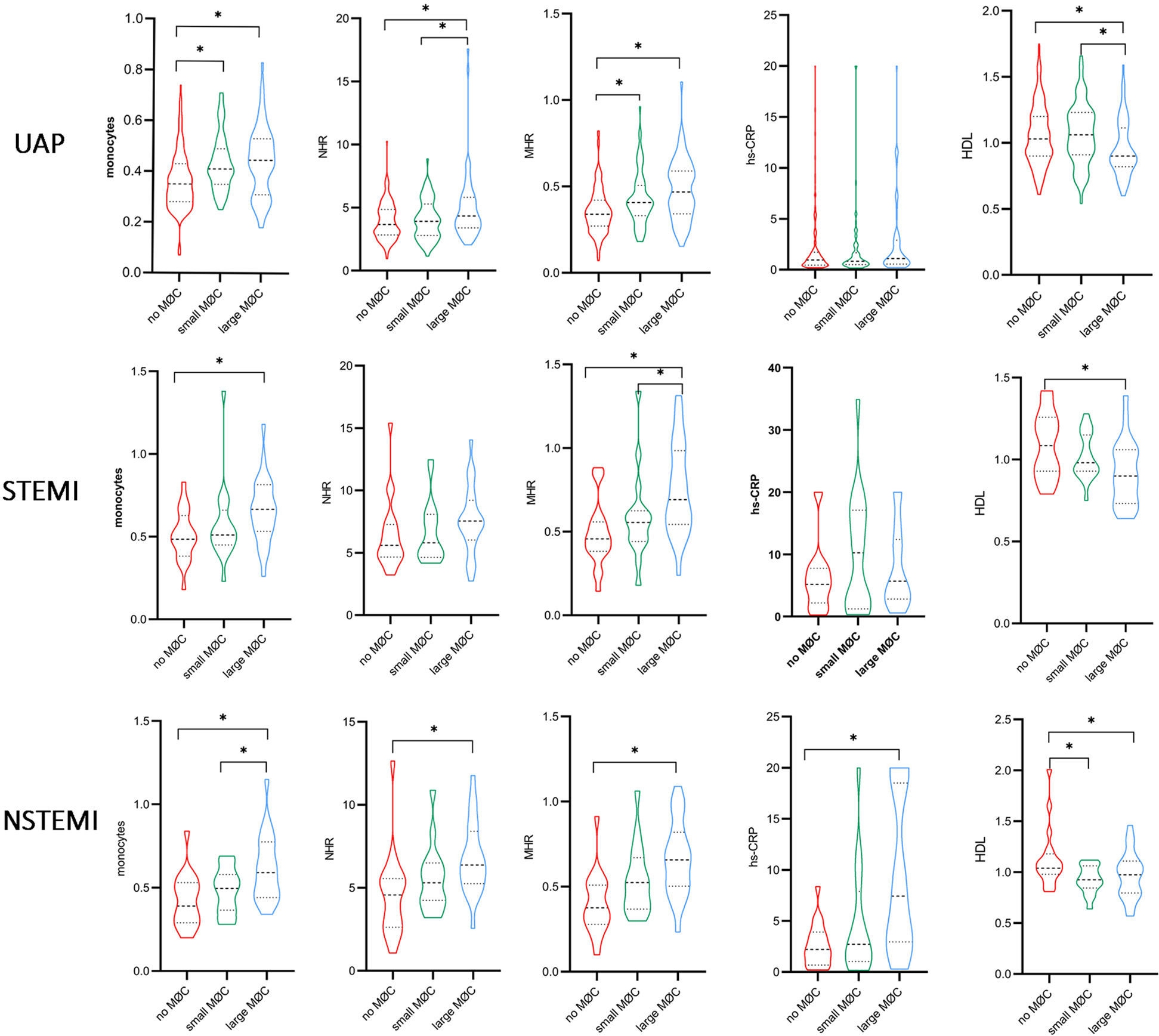 MØC, macrophage cluster; UAP, unstable angina pectoris; NSTEMI, non-ST-segment elevation myocardial infarction; STEMI, ST-segment elevation myocardial infarction; hs-CRP, high-sensitivity C-reactive protein; LDLC, low-density lipoprotein cholesterol; HDLC, high-density lipoprotein cholesterol; NHR, neutrophil/HDL ratio; MHR, monocyte/HDL ratio; TCFA, Thin cap fibroatheromas; MLA, minimal lumen area; FCT, fibrous cap thickness; LVEF, left ventricular ejection fraction.