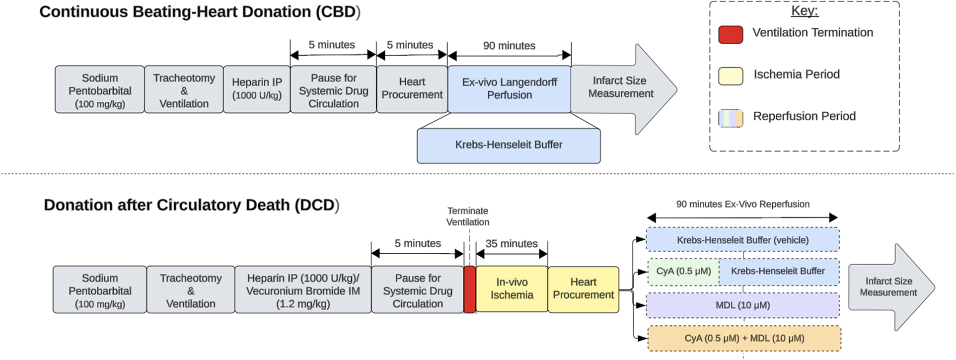 Experimental design. Experimental design comparing continuous beating-heart donation (CBD) and donation after circulatory death (DCD) procedures. The red section indicates ventilator termination, which initiates the ischemic period. The yellow sections represent in-vivo ischemia periods, while the blue sections represent ex-vivo reperfusion on the Langendorff apparatus. The reperfusion period for DCD hearts is divided into 5 categories based on the treatment paradigm used.