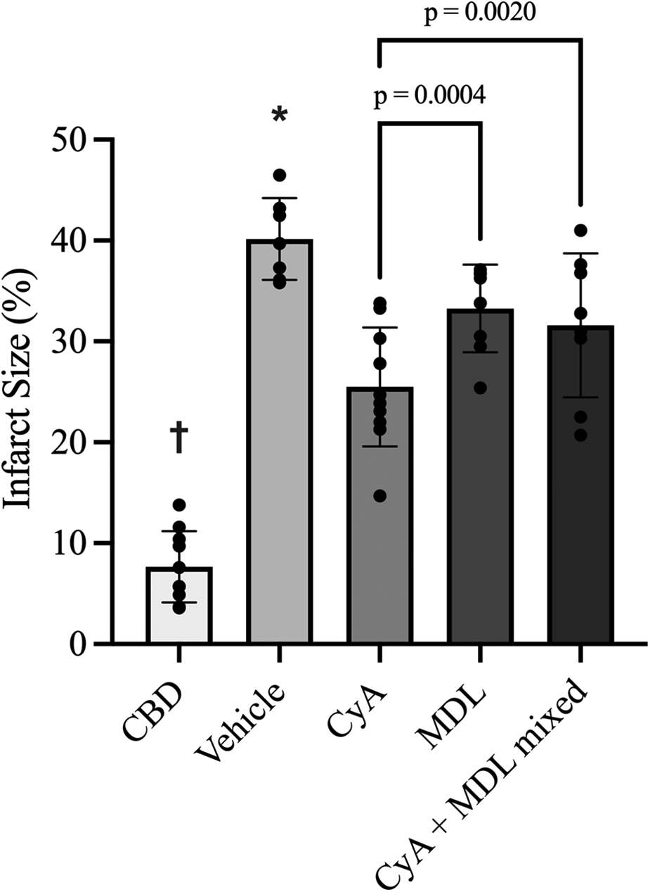 Data was analyzed using GraphPad Prism 10 Software (Boston, MA, USA). Normality of the data was assessed using the Shapiro–Wilk test. Comparisons of means for infarct size and functional data between groups were made using a one-way Analysis of Variance (ANOVA) with post-hoc Bonferroni correction if data passed the normality and equal distribution test. Data that failed the test of normality or equal distribution test were compared using a non-parametric Kruskal–Wallis one-way analysis of variance (ANOVA) on ranks followed by Dunn's analysis for multiple groups. A significance level of α < 0.05 was established a priori to analysis and all data are reported as mean ± standard deviation (SD).