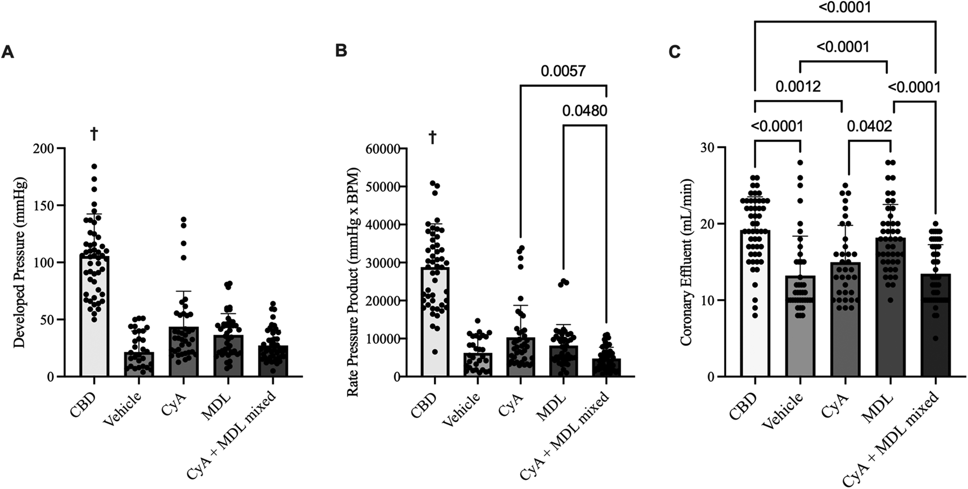 Comparison of aggregated left ventricular developed pressure (LVDP) (A), rate pressure product (RPP) (B), and coronary effluent (C) across experimental groups. A balloon catheter connected to a pressure transducer was placed into the left ventricle to record LVDP and RPP throughout the 90 min of reperfusion. Of the treated hearts, LVDP was highest in the CyA group (43.71 ± 4.97 mmHg) and lowest in the mixed CyA + MDL group (27.22 ± 13.45 mmHg). No differences were noted between the mixed CyA + MDL group and CyA-treated (43.71 ± 31.05 mmHg) or MDL treated (36.52 ± 18.61 mmHg) hearts. Of the treated hearts, RPP was highest in the CyA-treated hearts (10,332 ± 8,417 mmHg*BPM) and lowest in the mixed CyA + MDL group (4,747 ± 2,965 mmHg*BPM). Coronary effluent was collected for 1 min at 15, 30, 45, 60 and 90 min of reperfusion. Flow rates varied between groups, with the highest rate in the MDL-treated hearts (18.18 ± 4.35 mL/min) and lowest in the mixed CyA + MDL group (13.46 ± 3.81 mL/min). One-way analysis of variance used for statistical analysis. All data expressed as mean ± SD. † Represents statistical significance (p < 0.05) between CBD hearts and all other groups.
