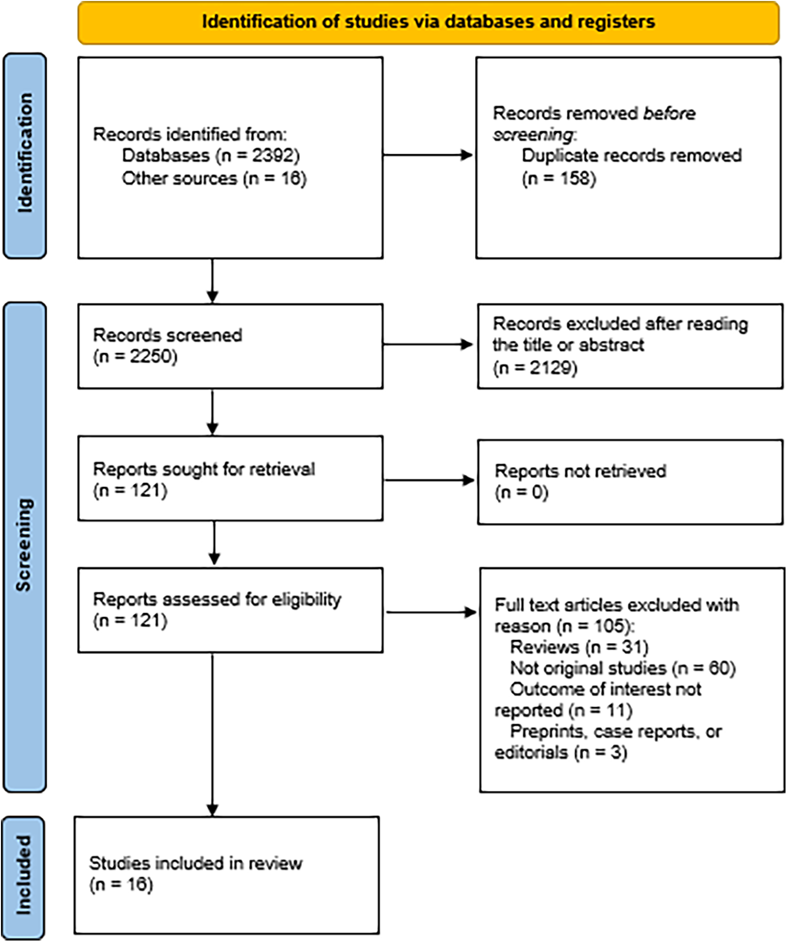 A total of 2,408 studies were identified after a step-by-step screening process. Following duplicate study removal, assessment of abstracts based on inclusion and exclusion criteria, and a thorough review of the full texts, 16 studies were selected to be included in this analysis (4–6, 8, 9, 16–26). The PRISMA flowchart illustrates the details in Figure 1.