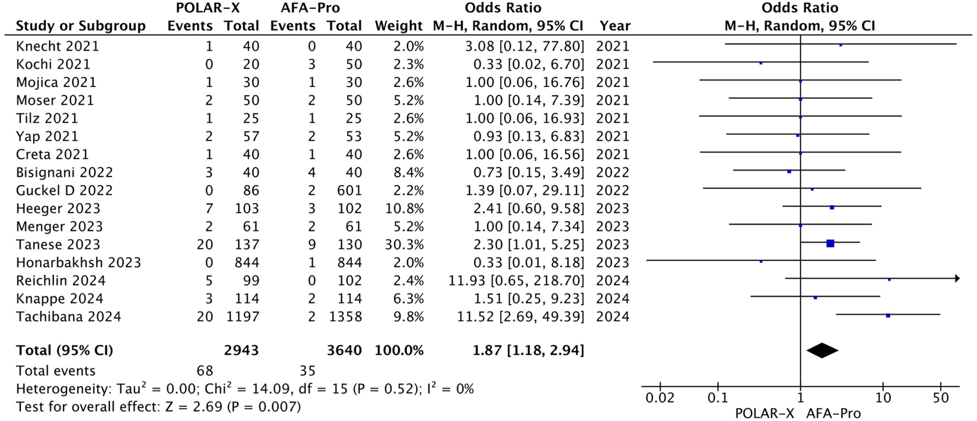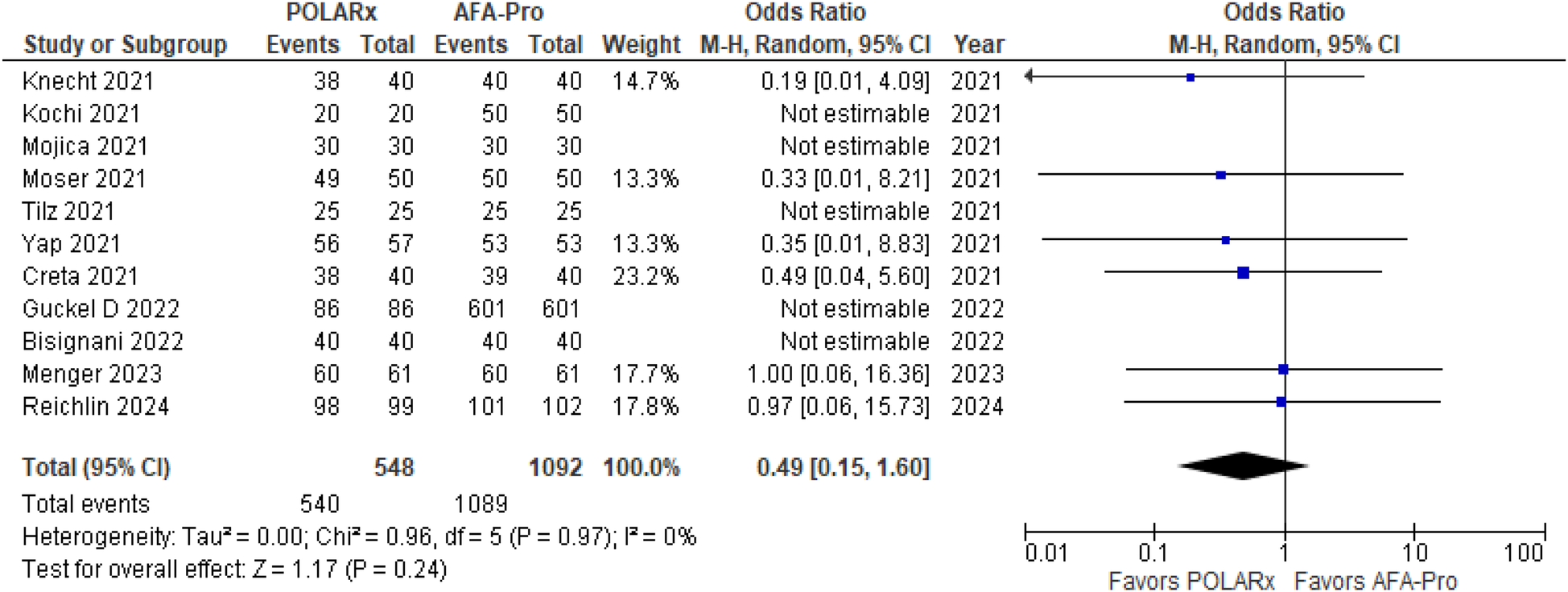 Eleven of the Sixteen reported on acute PVI, with a total of 1,640 participants (548 in the POLARx group and 1,092 in the AFA group). Our analysis showed that both techniques were comparable in terms of acute PVI (OR = 0.49, 95% CI: 0.15–1.60, P = 0.24, I2 = 0%. Z = 1.17; Figure 2).