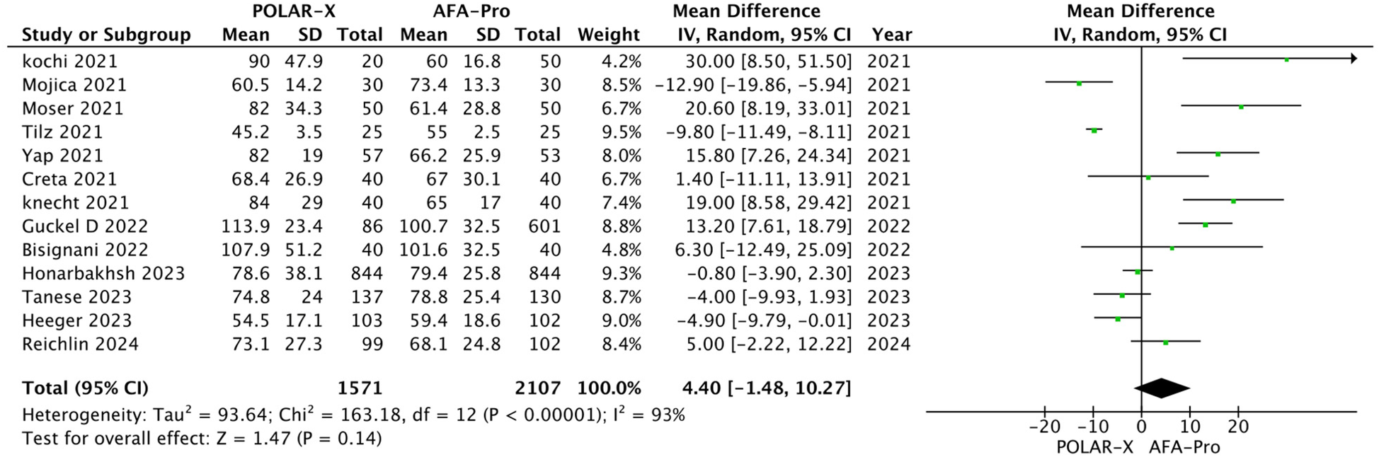 Thirteen studies reported procedure time, with 3,678 participants (1,571 in the POLARx group and 2,107 in the AFA group). Our analysis indicated that POLARx was comparable to ArcticFront in terms of procedure time (MD = 4.40, 95% CI: −1.48 to 10.27, P = 0.14, I2 = 93%, Z = 1.47; Figure 3).