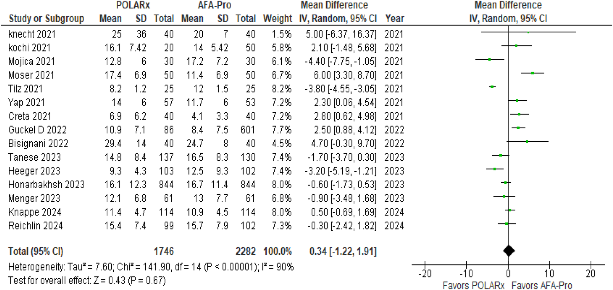Fluoroscopy time was reported in 15 of the 16 studies, involving a total of 4,028 participants (1,746 in the POLARx group and 2,282 in the AFA group). Our analysis revealed that both techniques were comparable in terms of fluoroscopy time (MD = 0.34, 95% CI: −1.22 to 1.91, P = 0.67, I2 = 90%, Z = 0.43; Figure 5).