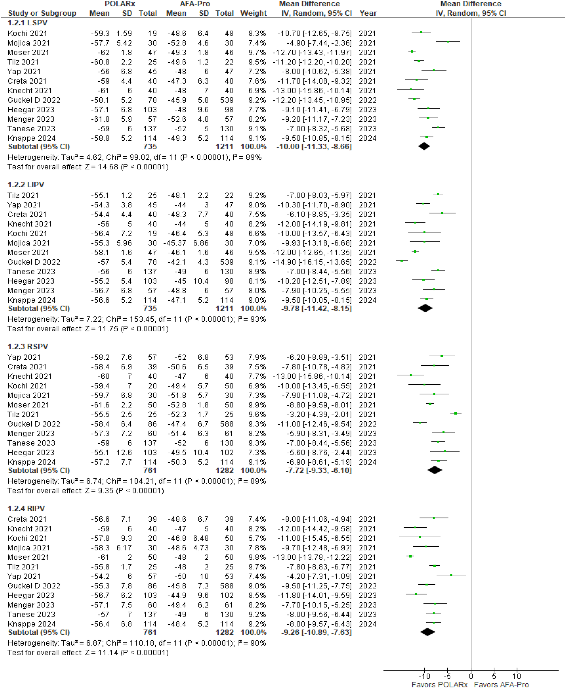 There were no significant differences between POLARx and AFA in acute PVI success (OR = 0.49, P = 0.24), procedure time (MD = 4.40, P = 0.14), ablation time (SMD = 0.12, P = 0.10), fluoroscopy time (MD = 0.34, P = 0.67), freezing time and stroke rates. POLARx showed a significant advantage in balloon nadir temperature (P < 0.00001) and demonstrated longer time to isolation (TTI) in the RSPV (MD = 5.49, P = 0.05) and RIPV (MD = 4.54, P = 0.04), while TTI was similar for the LSPV and LIPV. However, POLARx was associated with a higher risk of PNP (OR = 1.87, P = 0.007).