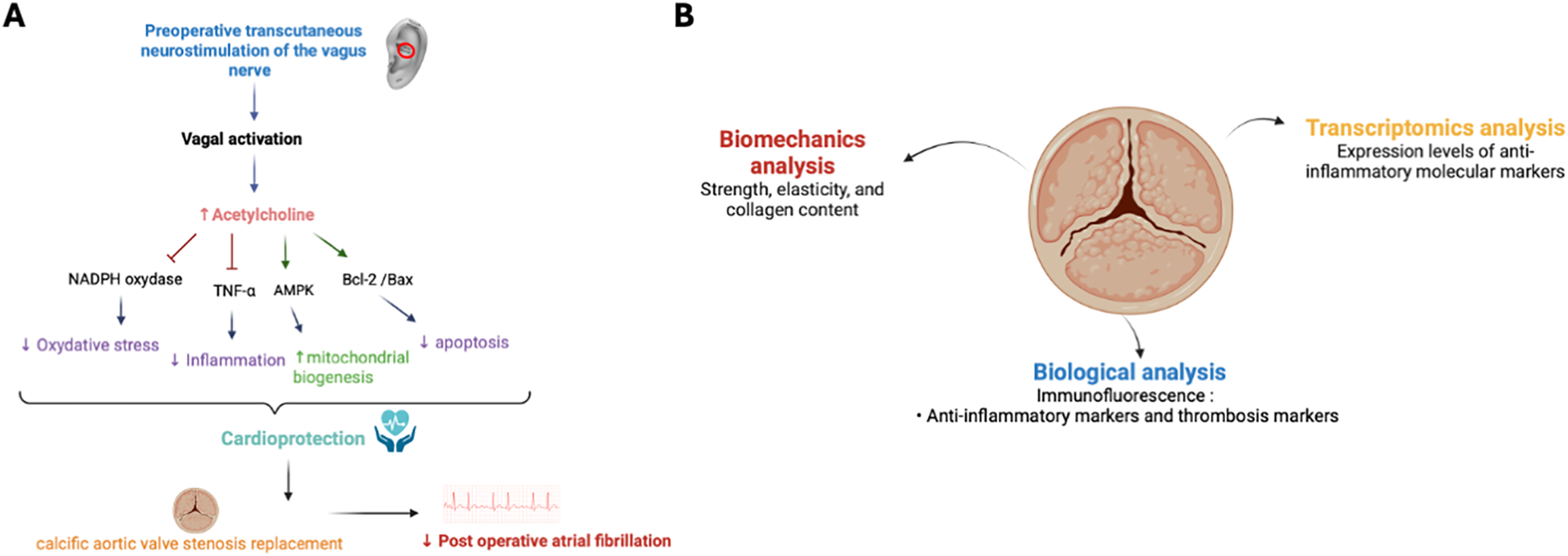 Mechanisms and translational analysis of cardioprotection and calcific aortic valve stenosis (CAVS). (A) Mechanisms of cardioprotection induced by preoperative transcutaneous vagus nerve stimulation (tVNS) in CAVS replacement. Increasing vagal tone through vagus nerve stimulation (tVNS), physical exercise, and/or pharmacological agents offers various cardioprotective benefits. These include antioxidant, anti-inflammatory, and anti-apoptotic effects, alongside the regulation of mitochondrial biogenesis and mitophagy. Arrows denote activation, while T-bars signify inhibition. AMPK stands for AMP-activated protein kinase, TNF-α refers to tumor necrosis factor-α and nicotinamide adenine dinucleotide phosphate. (B) Translational analysis of calcific aortic valve stenosis (CAVS). Illustration of the multimodal approach used to investigate calcific aortic valve stenosis (CAVS). Biomechanical analysis assesses strength, elasticity, and collagen content of the calcified valve. Biological analysis, including immunofluorescence, focuses on detecting anti-inflammatory and thrombosis markers. Transcriptomic analysis evaluates the expression levels of molecular markers associated with inflammation and thrombosis.