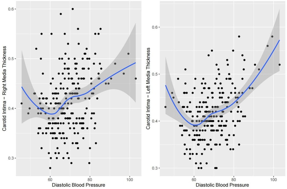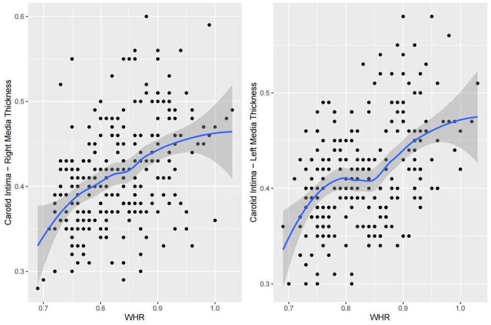 Nonlinear fitting was performed to analyze the trends between each indicator and cIMT. The piecewise regression analysis identifies exact inflection points under different trends. For SBP, right cIMT remained relatively stable between 95.0 and 115.7 mmHg but showed a steep increase as SBP exceeded 115.7 mmHg; left cIMT remained relatively stable between 93.3 and 131.0 mmHg but showed a steep increase as SBP exceeded 131.0 mmHg (Figure 2). With respect to DBP, a multi-phase association was also observed. Right cIMT decreased as DBP increased from 40.0 to 60.0 mmHg, and then increased markedly above 70.9 mmHg. Left cIMT declined with increasing DBP up to 58.7 mmHg, and increased rapidly above 81.8 mmHg (Figure 3). In terms of BMI, the association with cIMT was complex and side-dependent. Right cIMT decreased gradually until BMI reached 22.3 kg/m2, and then rose above 26.0 kg/m2. Left cIMT showed a different trajectory, with a increase until 21.0 kg/m2, remained relatively stable between 21.0 and 23.0 kg/m2, and a sharp rise above 23.0 kg/m2 (Figure 4). The relationship between WHR and cIMT also demonstrated lateral differences. Right cIMT remained steadily rising during the increase in WHR. Left cIMT showed a stable phase between WHR 0.78 and 0.84, and a rapid increase above 0.84 (Figure 5).